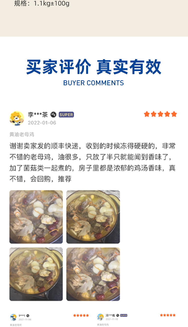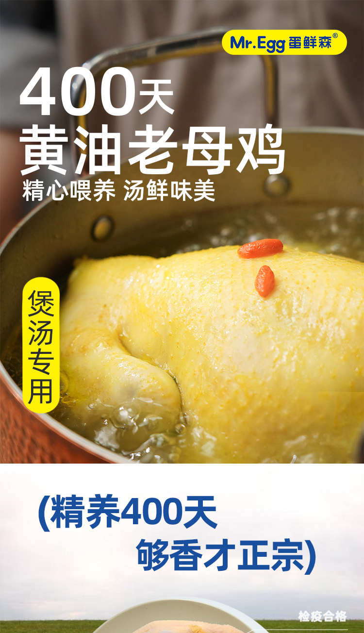 商品名称:(世星阳光) 蛋鲜森400天黄油老母鸡1100g±100g只 (1只装)煲汤专用活鸡现杀急冻真空保鲜