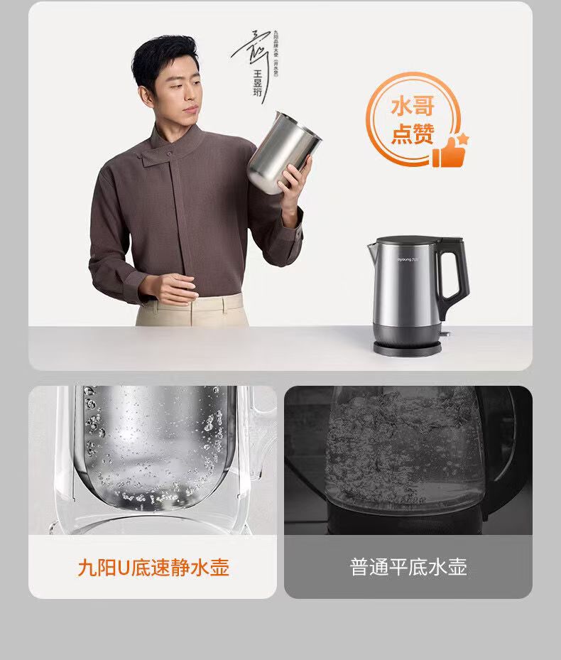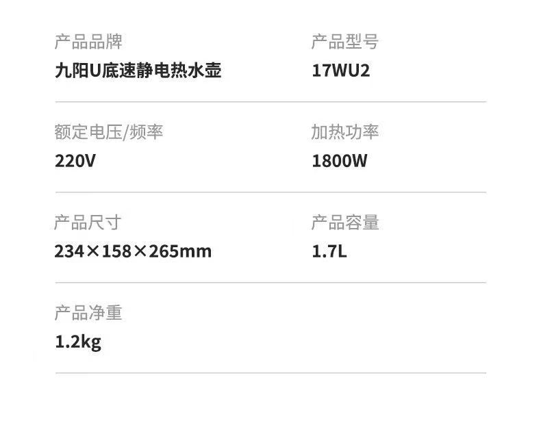 商品名称:(巨邦佑)T+九阳电热水壶烧水壶大容量 316L无缝内胆 U底轻音速沸电水壶热水壶家用防烫 17WU2 1.7L