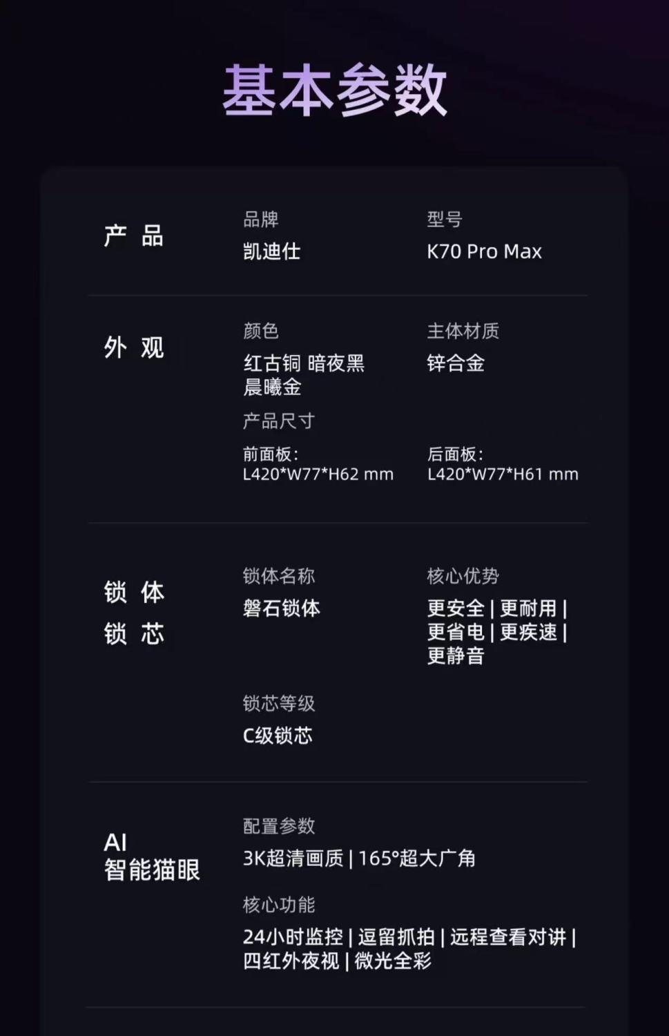 商品名称:(巨邦佑)T+凯迪仕(KAADAS)传奇大师K70 Pro Max掌静脉指纹锁智能门锁大屏1.1WmAh超强续航 掌静脉3D人脸-K70 Pro Max