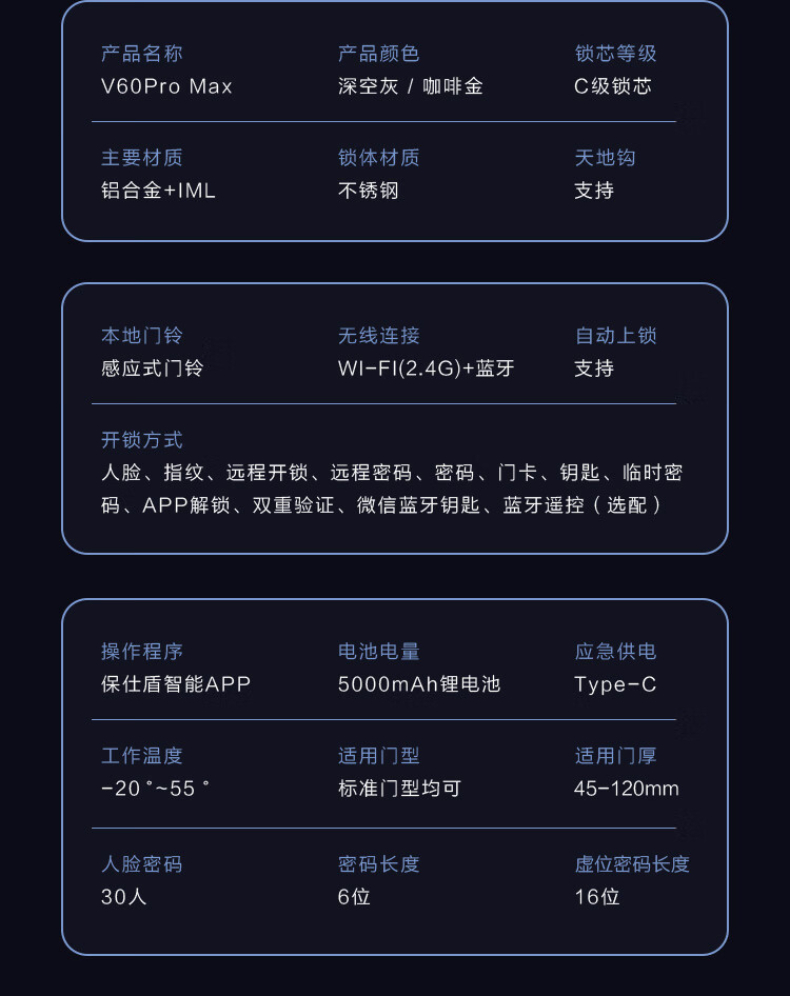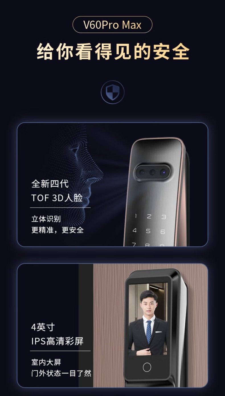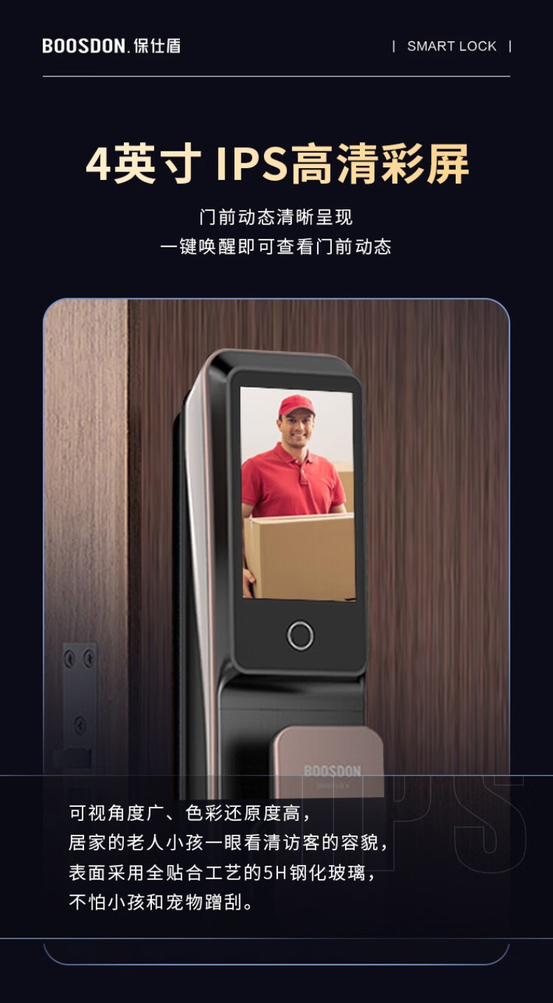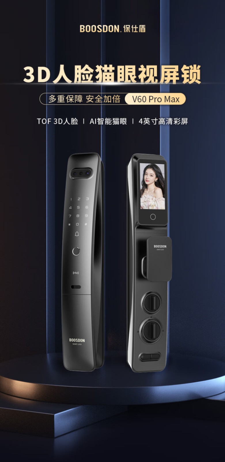 商品名称:(巨邦佑)BH+保仕盾(BOOSDON)V60 Pro指纹锁 智能门锁 3D人脸视屏密码锁 全自动电子锁 V60 Pro咖啡金 标准锁体