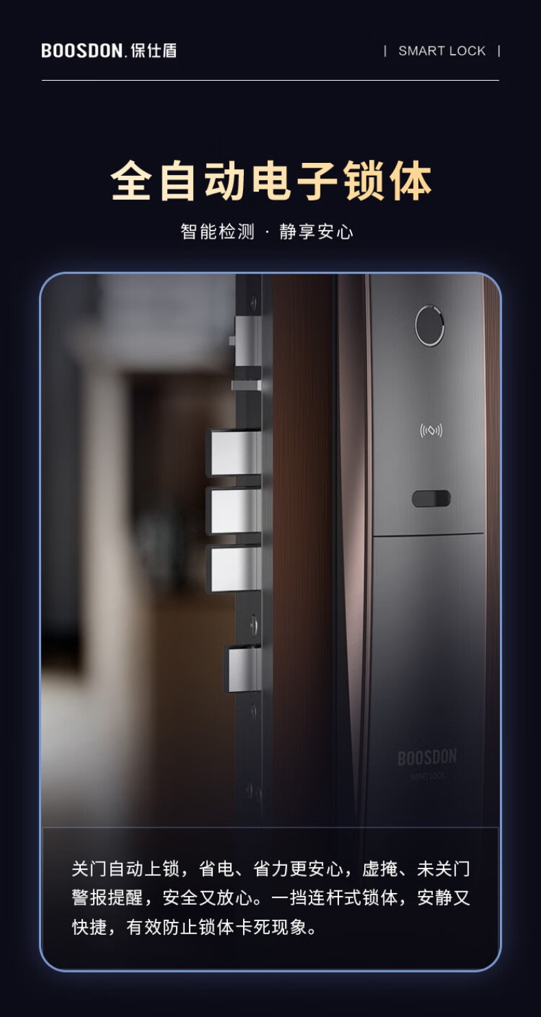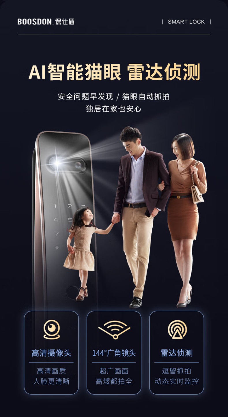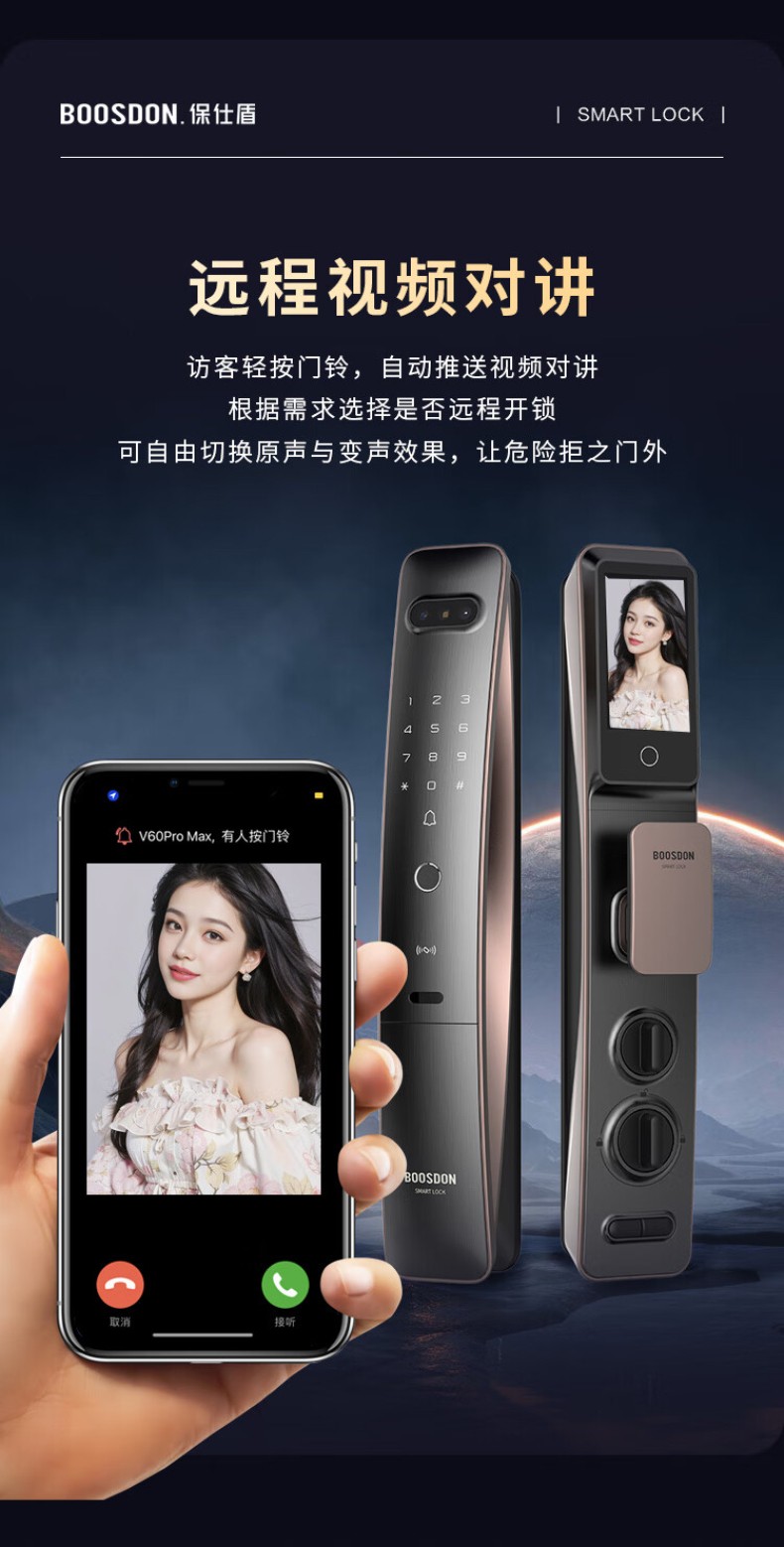 (巨邦佑)BH+保仕盾(BOOSDON)V60 Pro指纹锁 智能门锁 3D人脸视屏密码锁 全自动电子锁 V60 Pro咖啡金 标准锁体