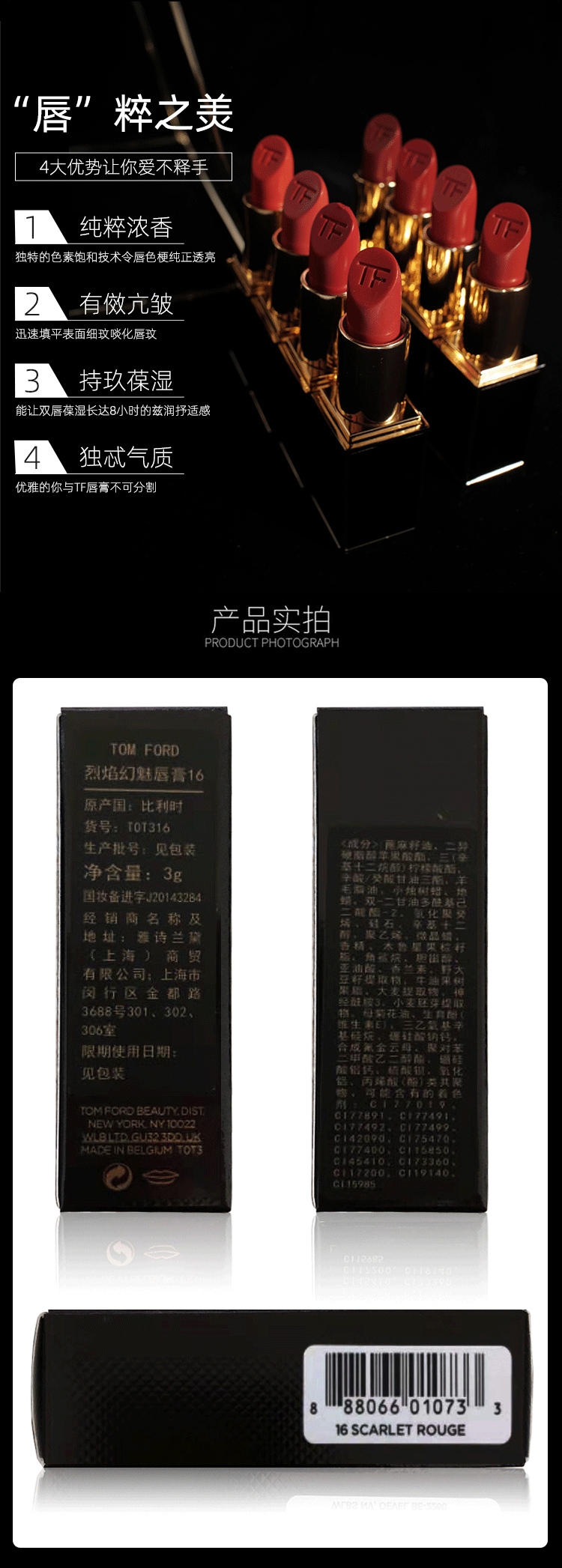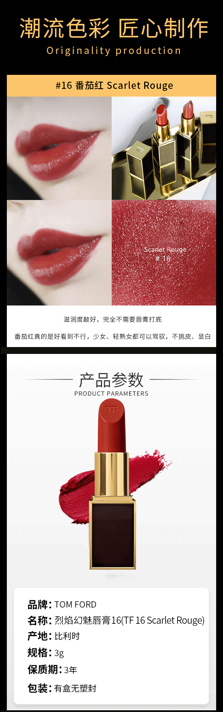 商品名称:(超运·禾贸)汤姆福特黑金黑管口红16斯嘉丽红(MY) 哑光斯嘉丽红唇膏