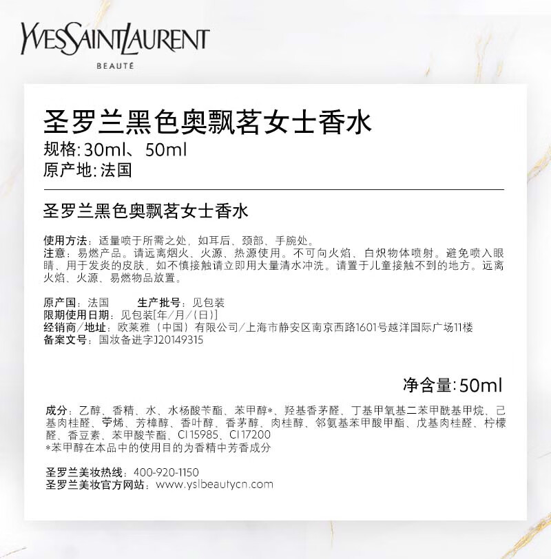 商品名称:(超运·禾贸)圣罗兰YSL 黑色奥飘茗女士香水50ml瓶(经典款)(FH) 女士香水化妆品生日礼物女送女友
