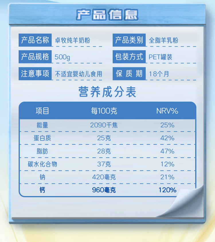 商品名称:(世星阳光) 卓牧纯羊奶粉500g罐 羊奶成人全脂纯羊奶粉中老年年货送礼