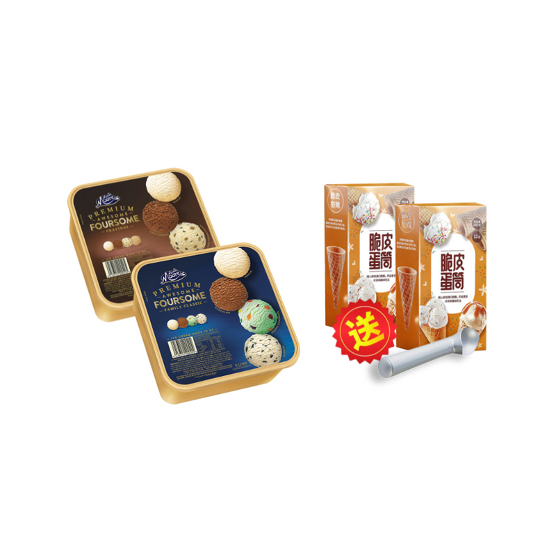 商品名称:(巨邦佑)BJ+玛琪摩尔复购蛋筒组合 2L金盒*2+24支蛋筒+挖球勺 新西兰进口桶装冰激凌全乳脂奶香