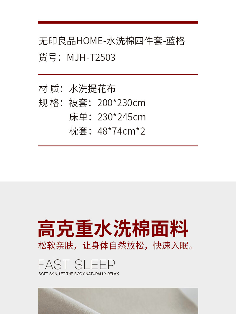 商品名称:(巨邦佑)BJ+无印良品HOME水洗棉四件套-蓝格 材质:水洗提花布(80%以上含棉量) 松软亲肤活性印染工艺