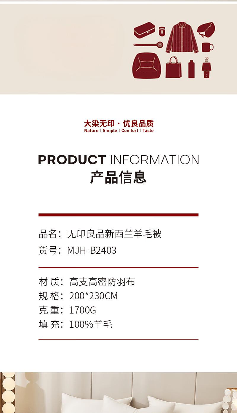 (巨邦佑)BJ+无印良品新西兰羊毛被200*230cm 填充100%羊毛 高支高密防羽布面料 蓬松保暖