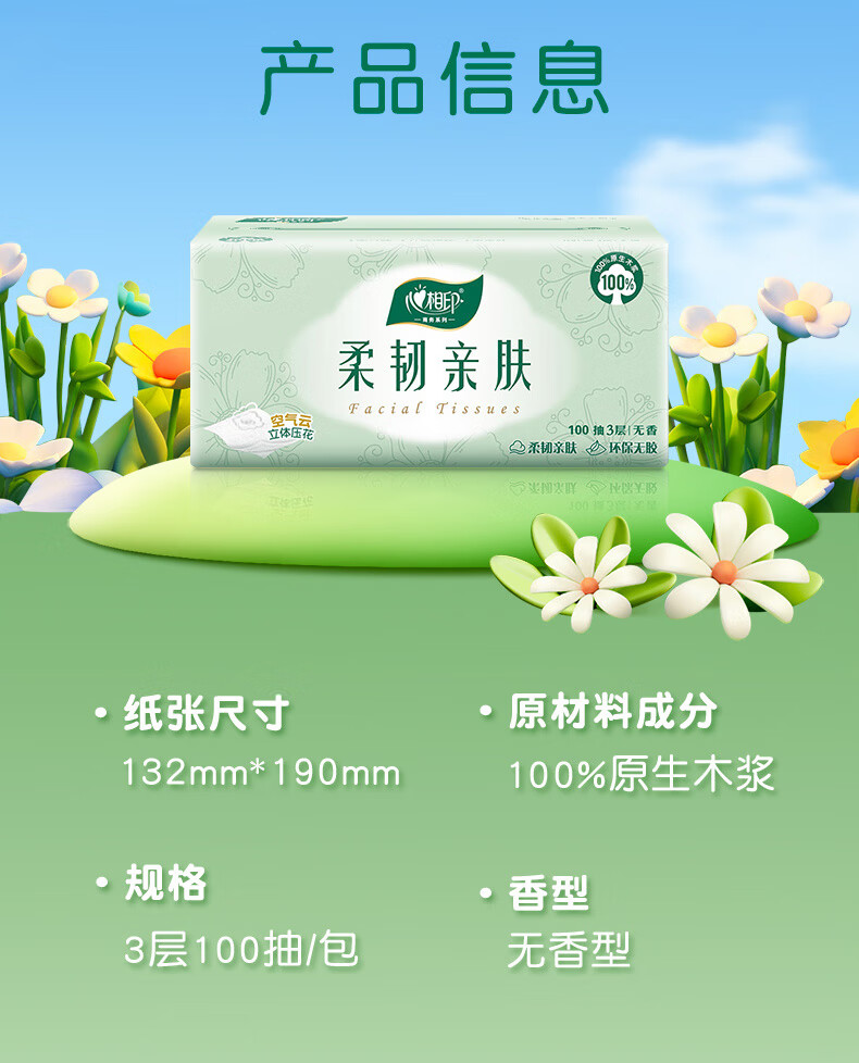 商品名称:(世星阳光)心相印塑装抽纸(6包*1提2提)三层100抽 云感柔韧亲肤 6DT100(包装)