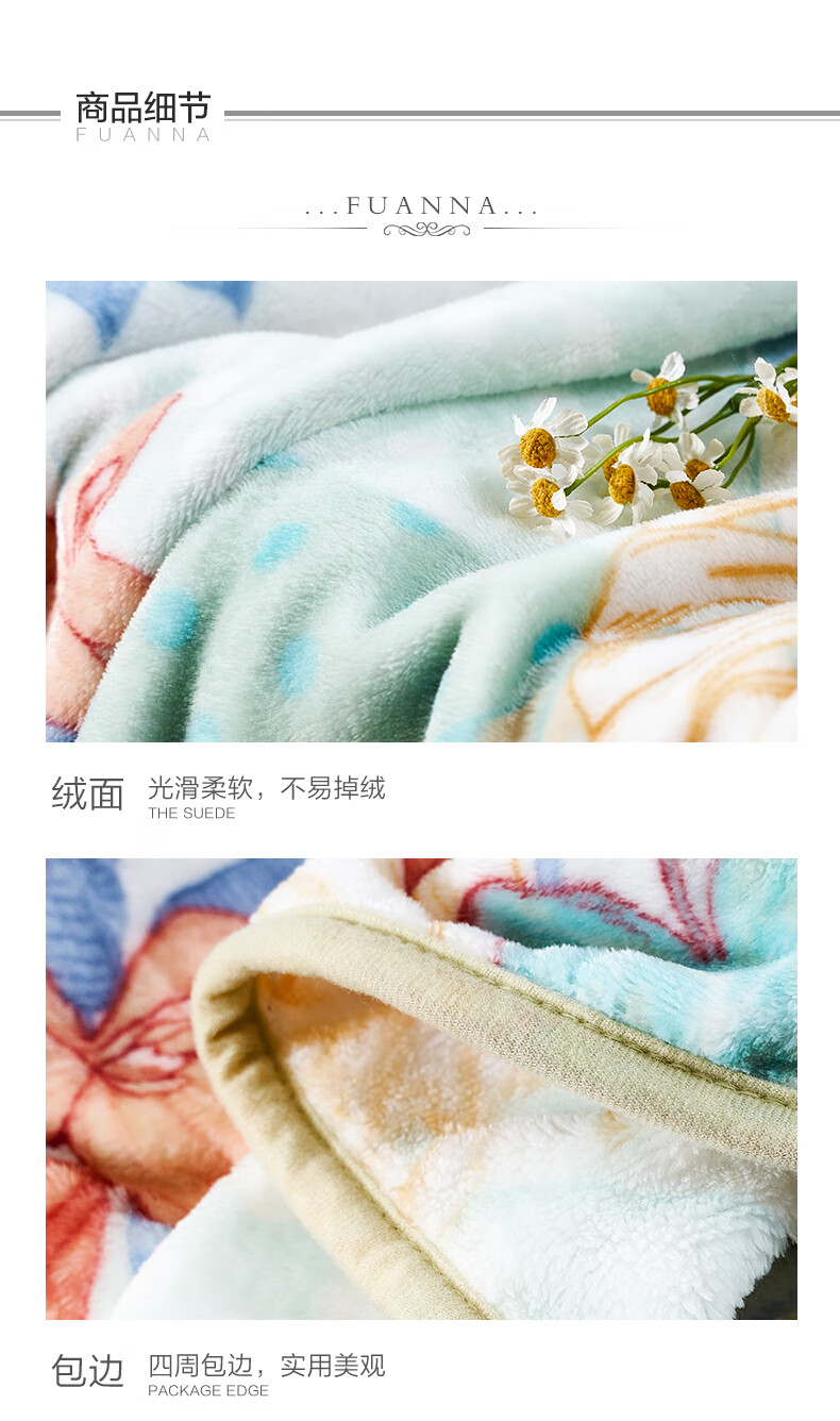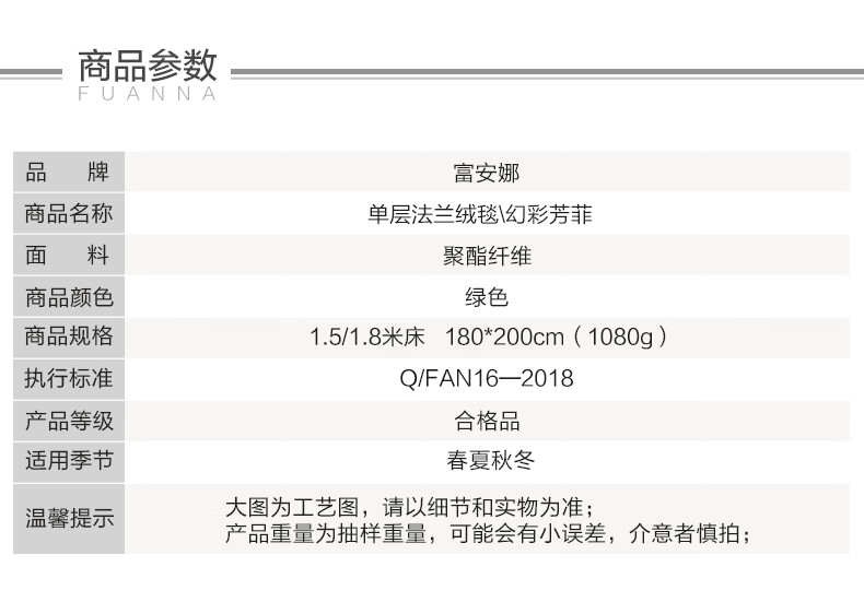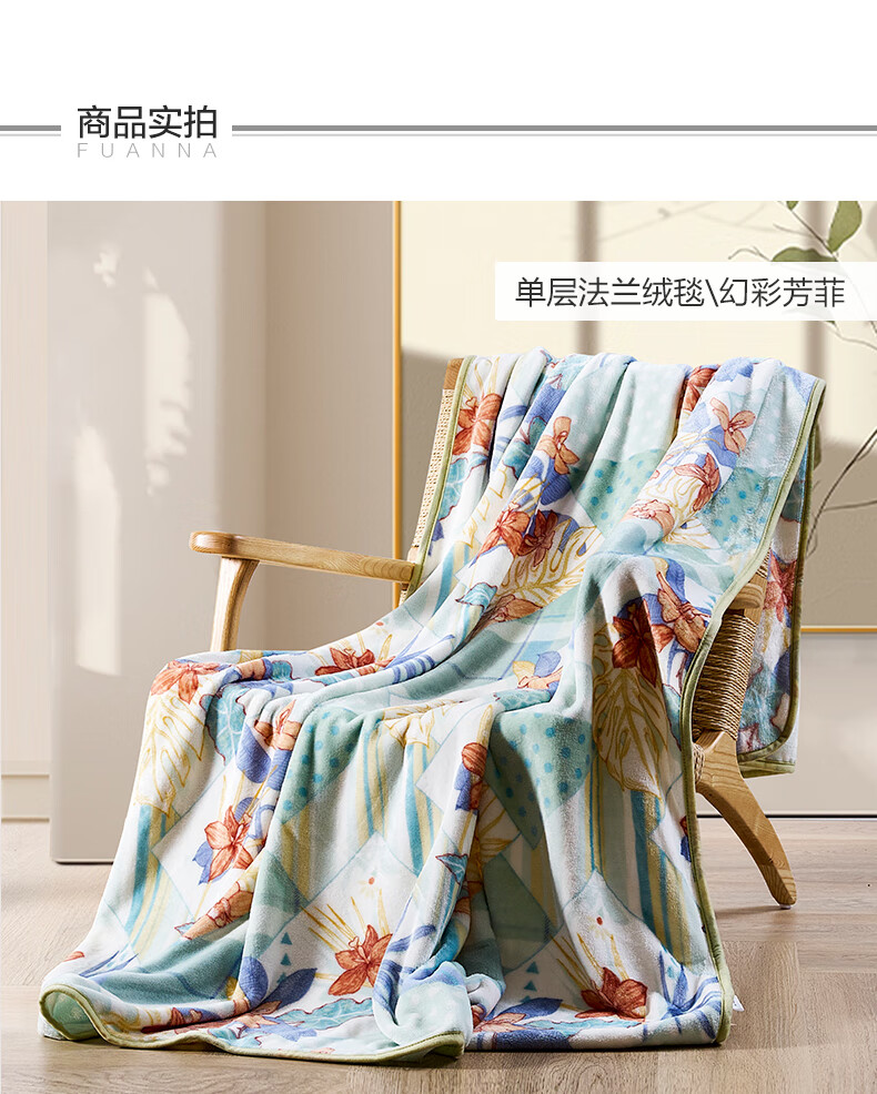 商品名称:(巨邦佑)BJ+富安娜单层法兰绒毯幻彩芳菲180*200cm 面料:100%聚酯纤维 亲肤柔软法兰绒