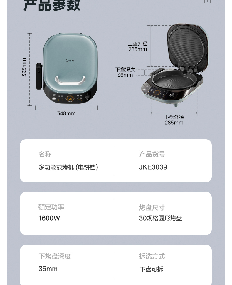 商品名称:(巨邦佑)R+美的(Midea)电饼铛MC-JKE3039双面加热煎烤机可拆卸全自动多功能家用烙饼锅加深悬浮烤盘烧烤大功率