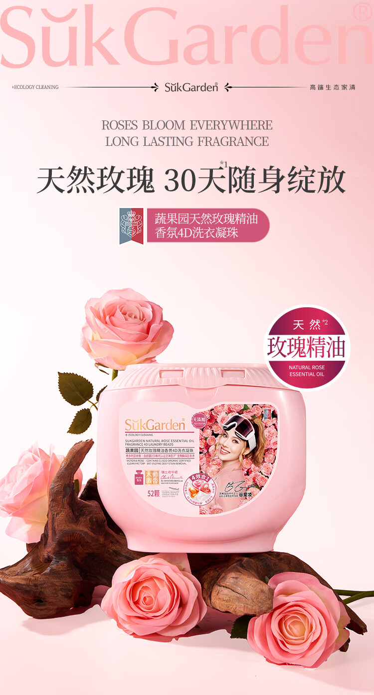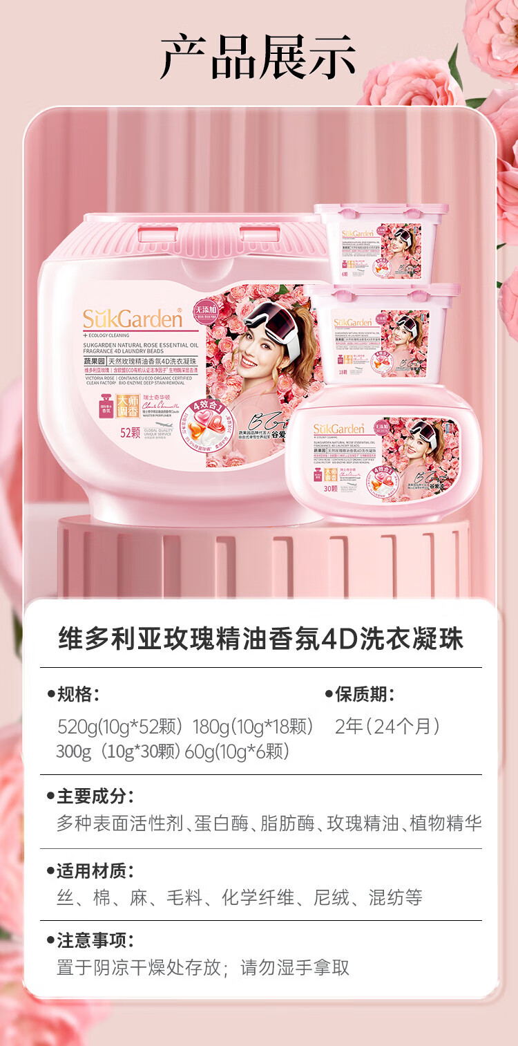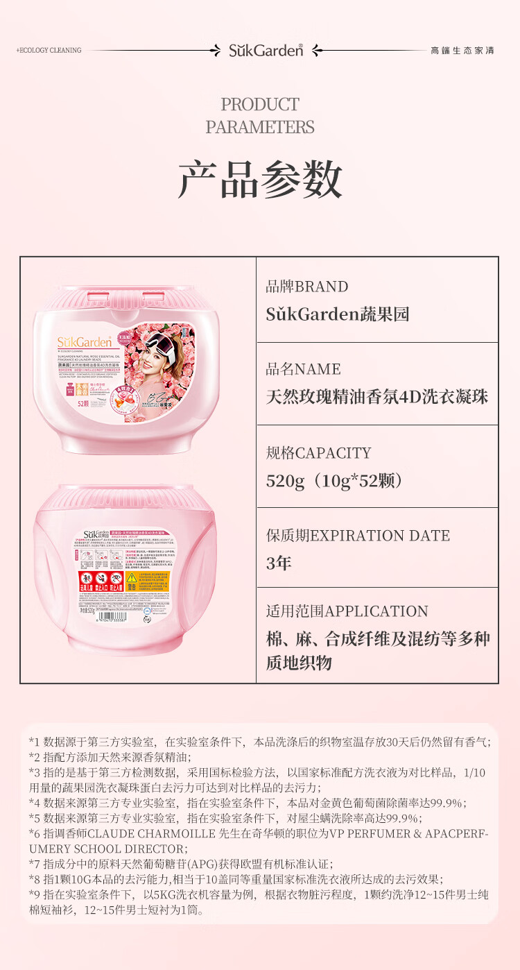 商品名称:(汇景缘)SukGarden蔬果园然玫瑰精油香氛4D洗衣凝珠10*52颗*2【SGY69024】深层去渍柔顺护衣除菌除螨4效合1