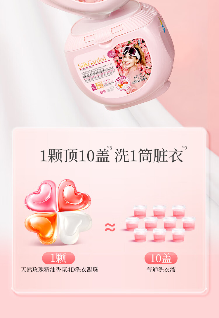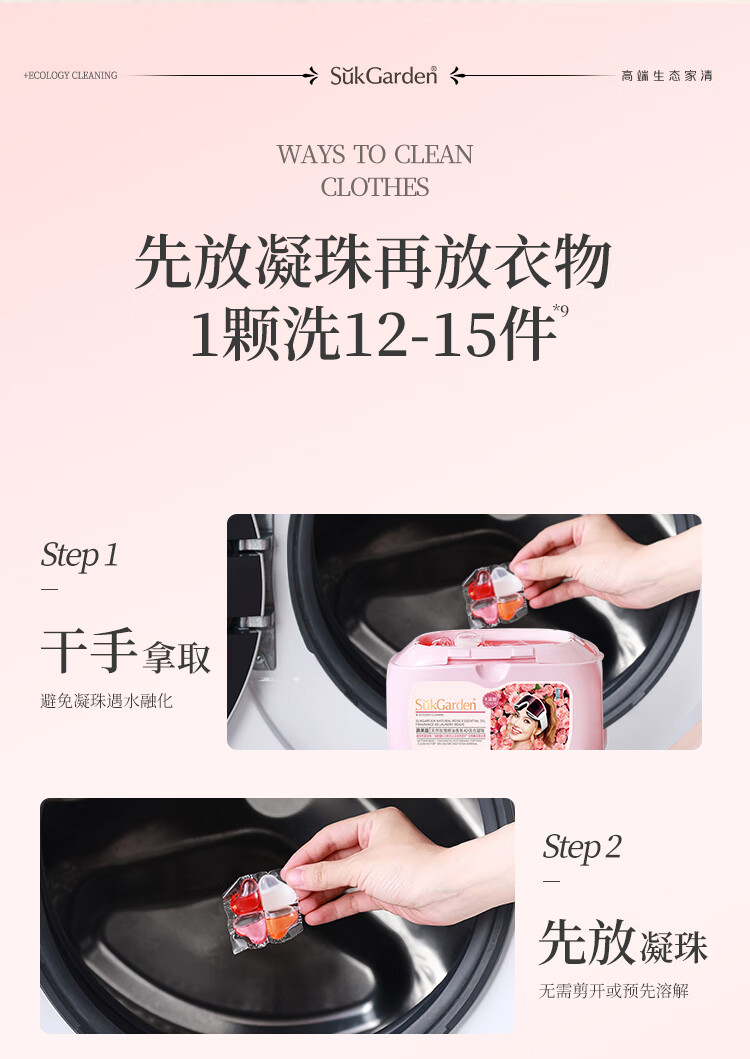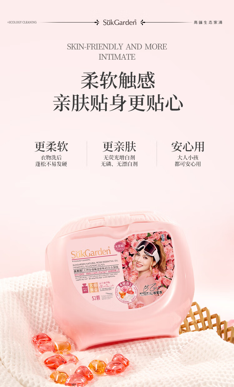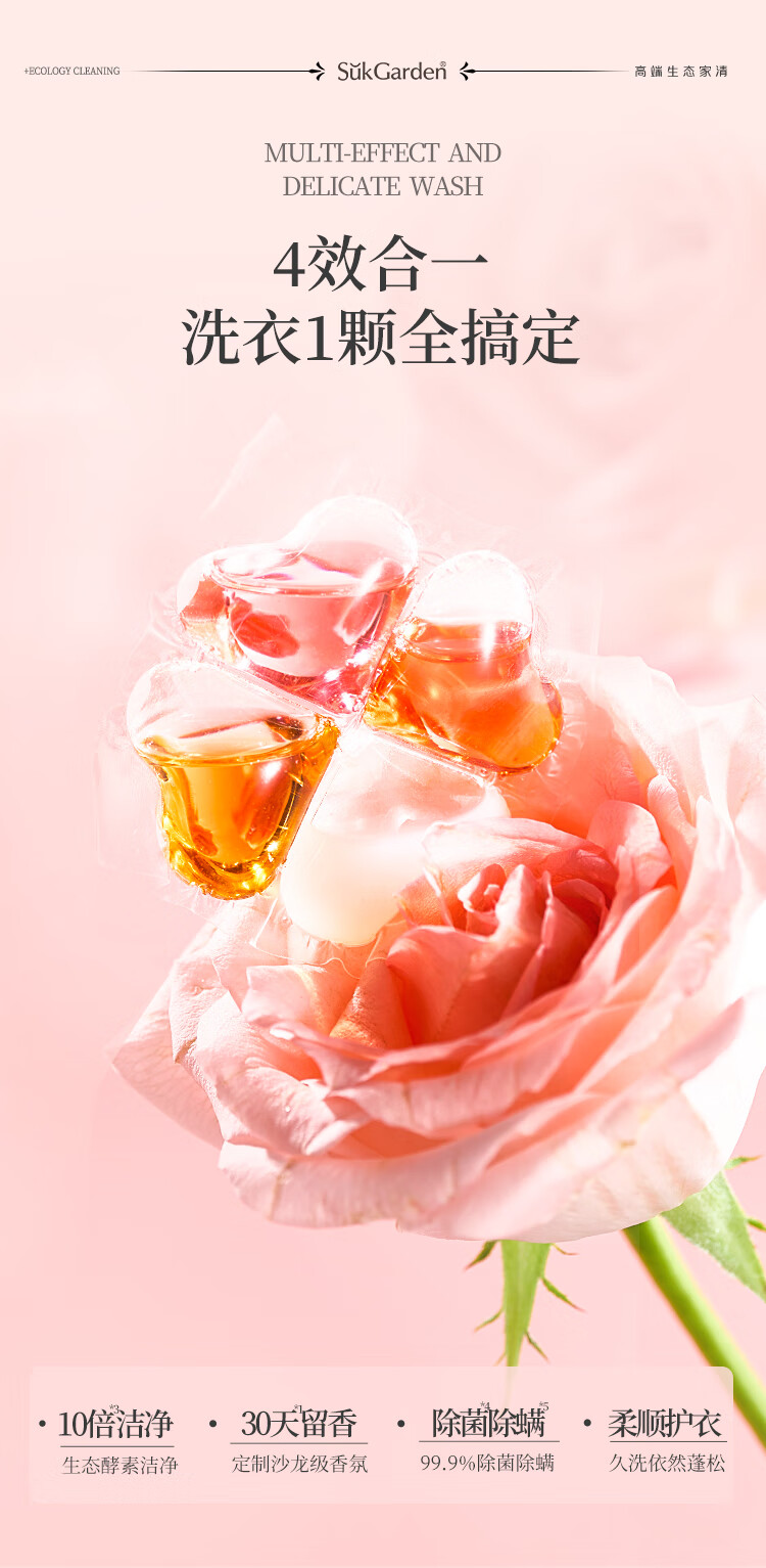 商品名称:(汇景缘)SukGarden蔬果园然玫瑰精油香氛4D洗衣凝珠10*52颗*2【SGY69024】深层去渍柔顺护衣除菌除螨4效合1