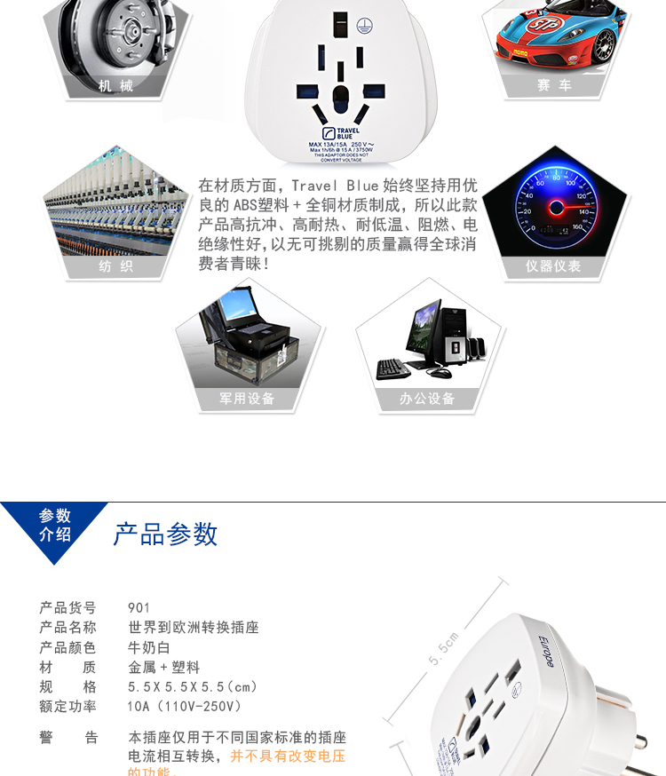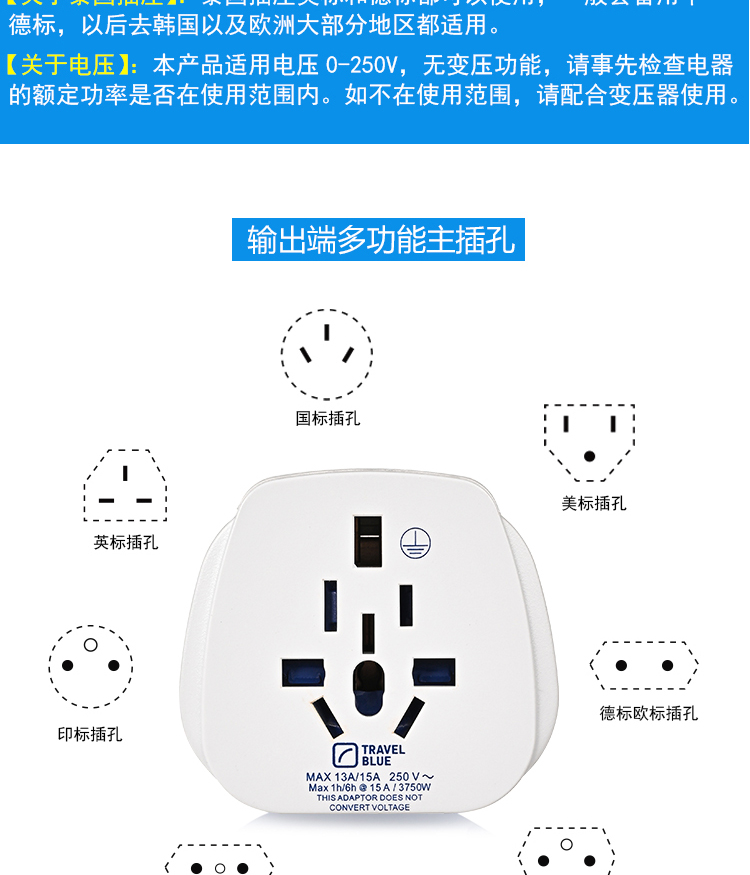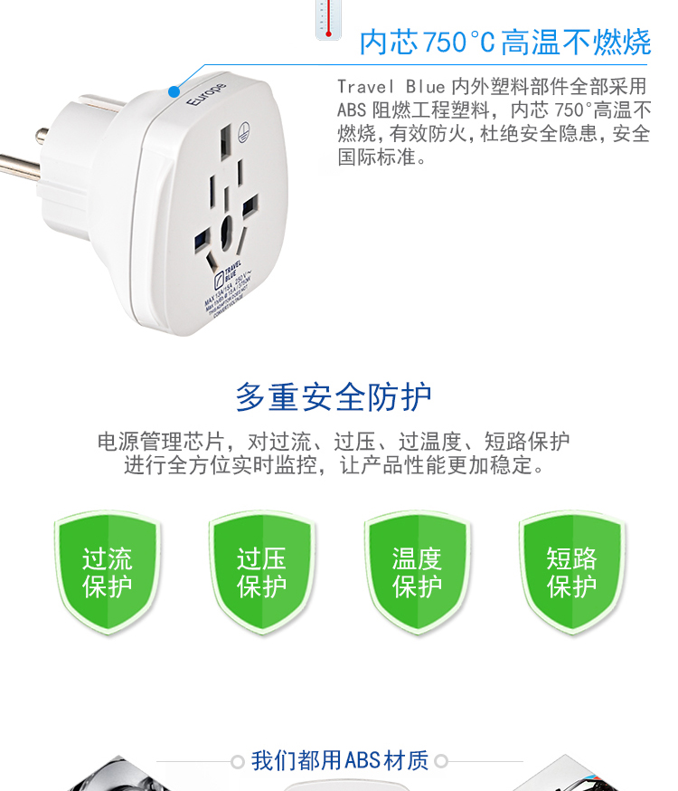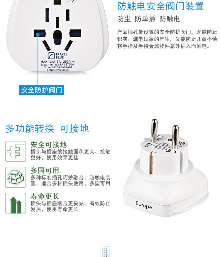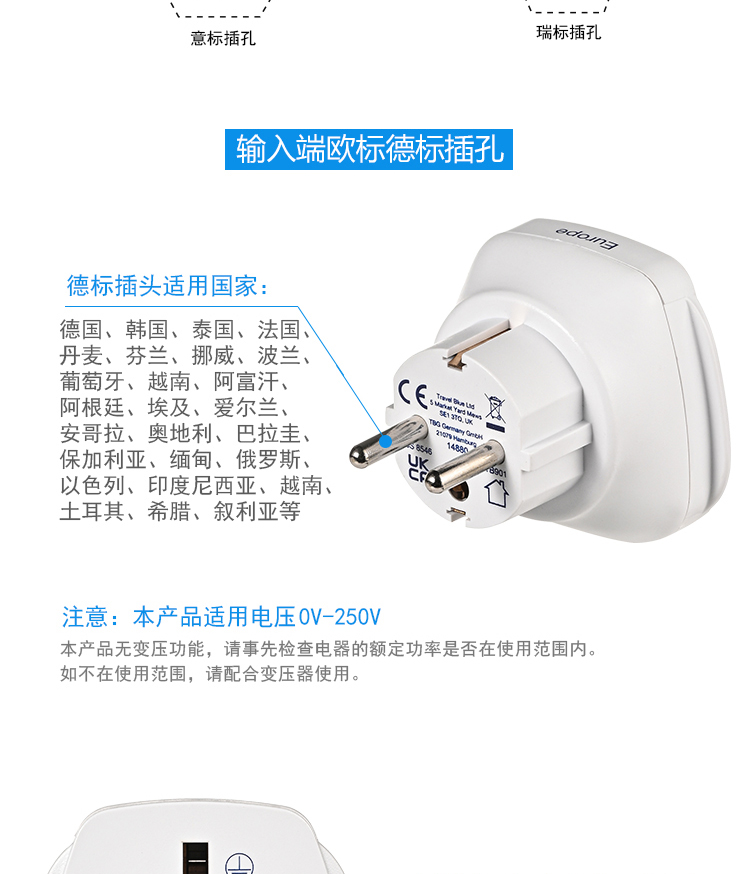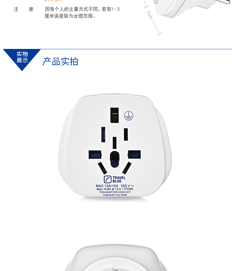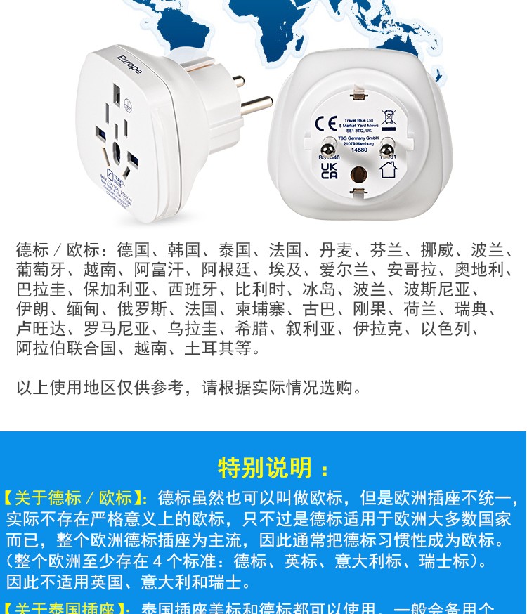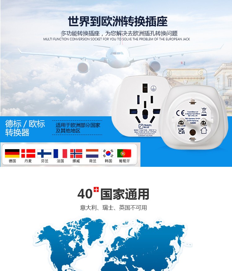 商品名称:(超运·禾贸)英国蓝旅Travel Blue世界到欧洲转换插座901 欧标德标转换插头 出国旅行德国泰国法国韩国电源转换器插座