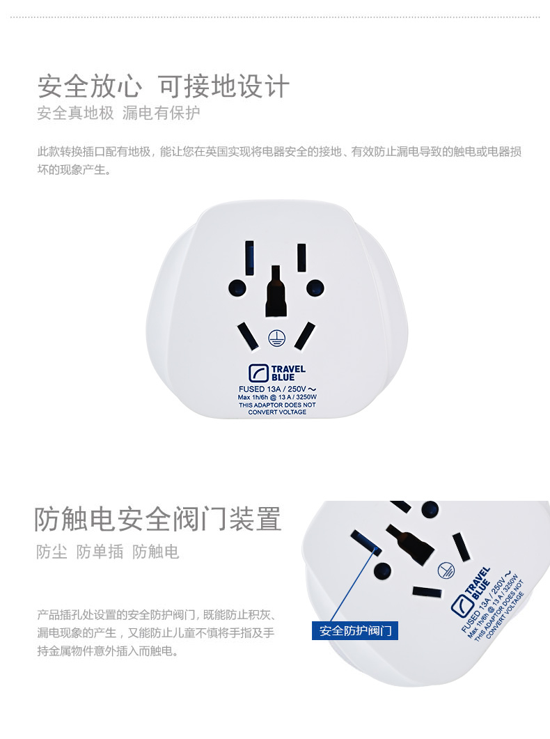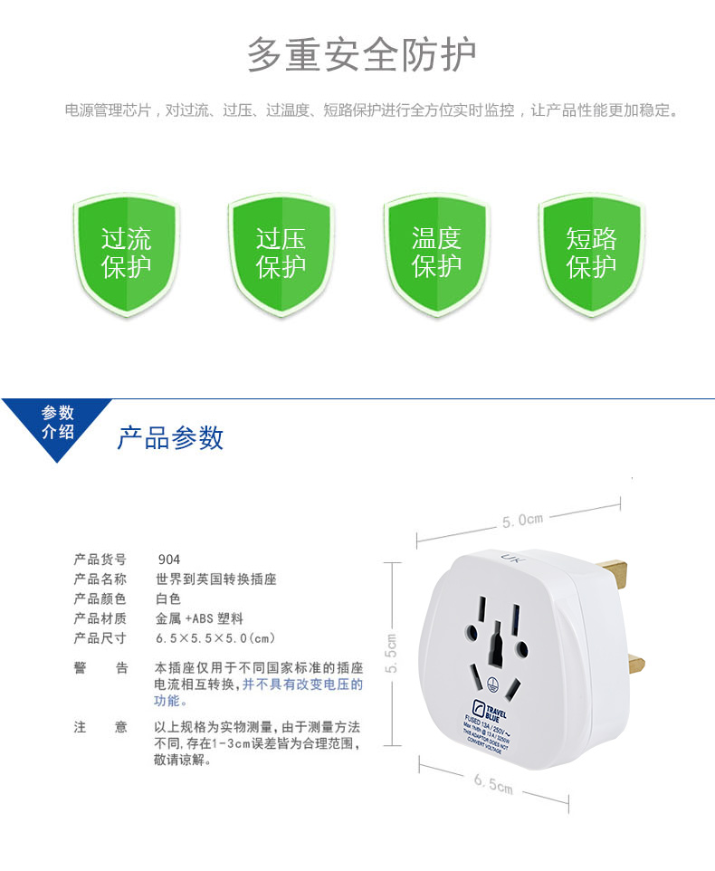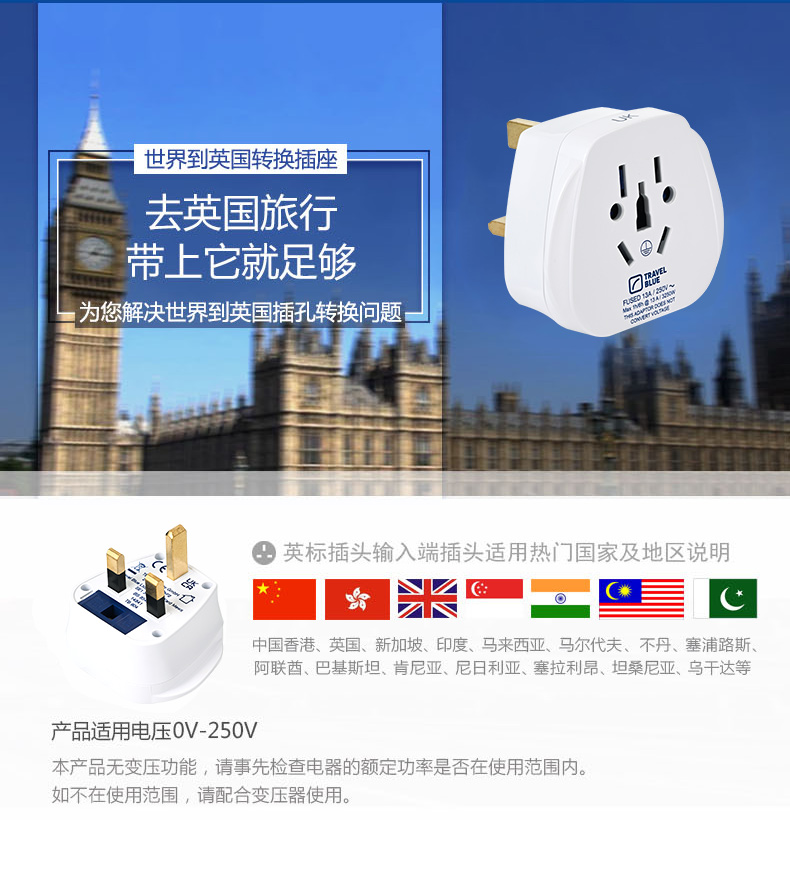商品名称:(超运·禾贸)英国蓝旅Travel Blue世界到英国转换插座904 英国转换插座英标香港新加坡电器转换