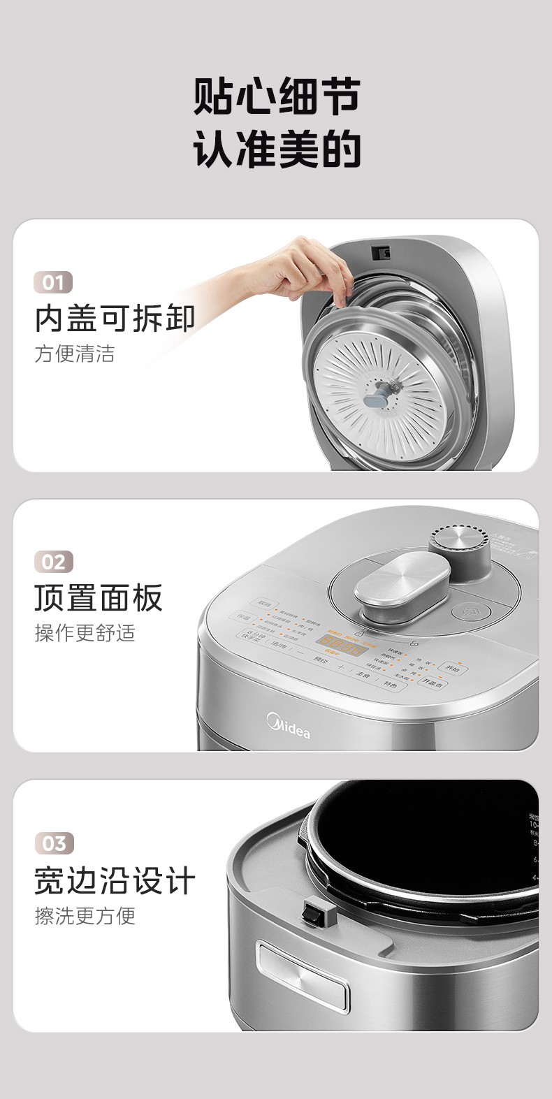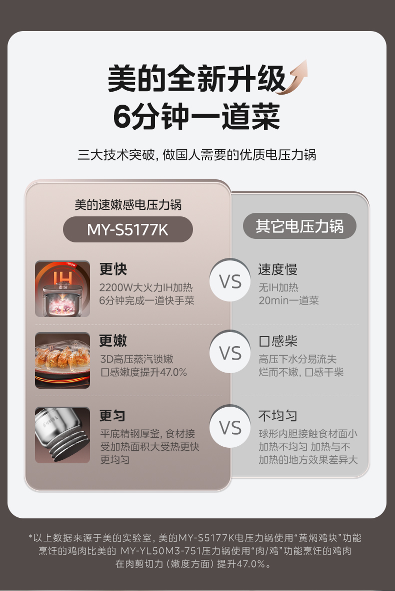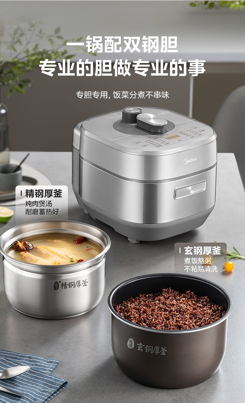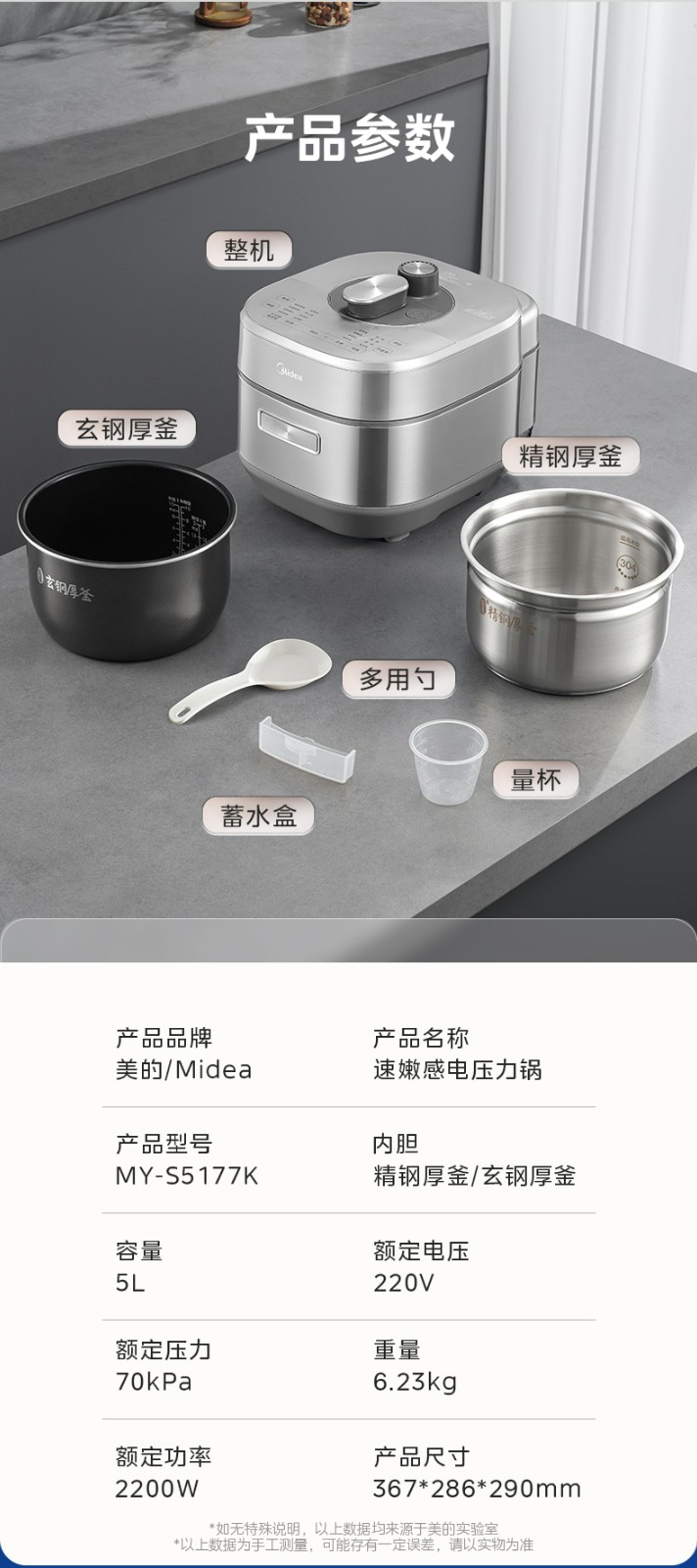 商品名称:(巨邦佑)R+美的(Midea)0涂层电压力锅S5177K 大容量家用速嫩感双胆IH全自动智能预约煲汤煮饭电饭煲高压锅 5L