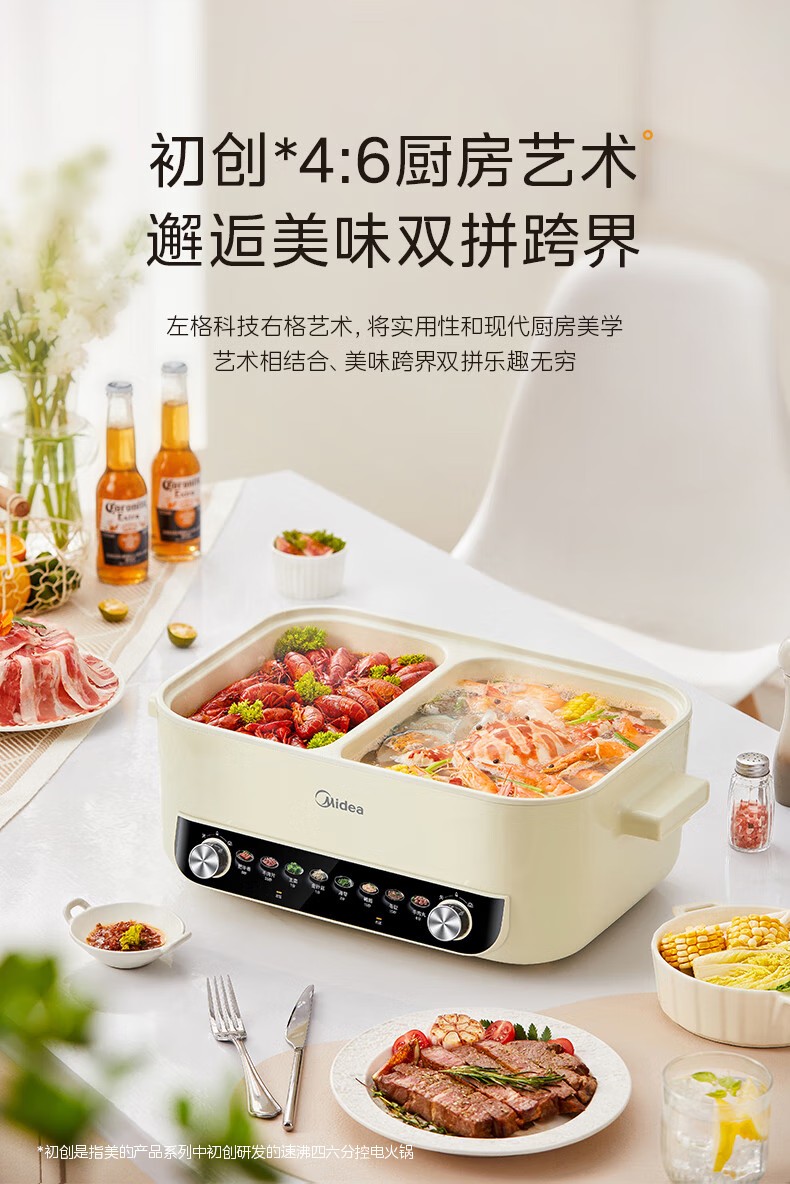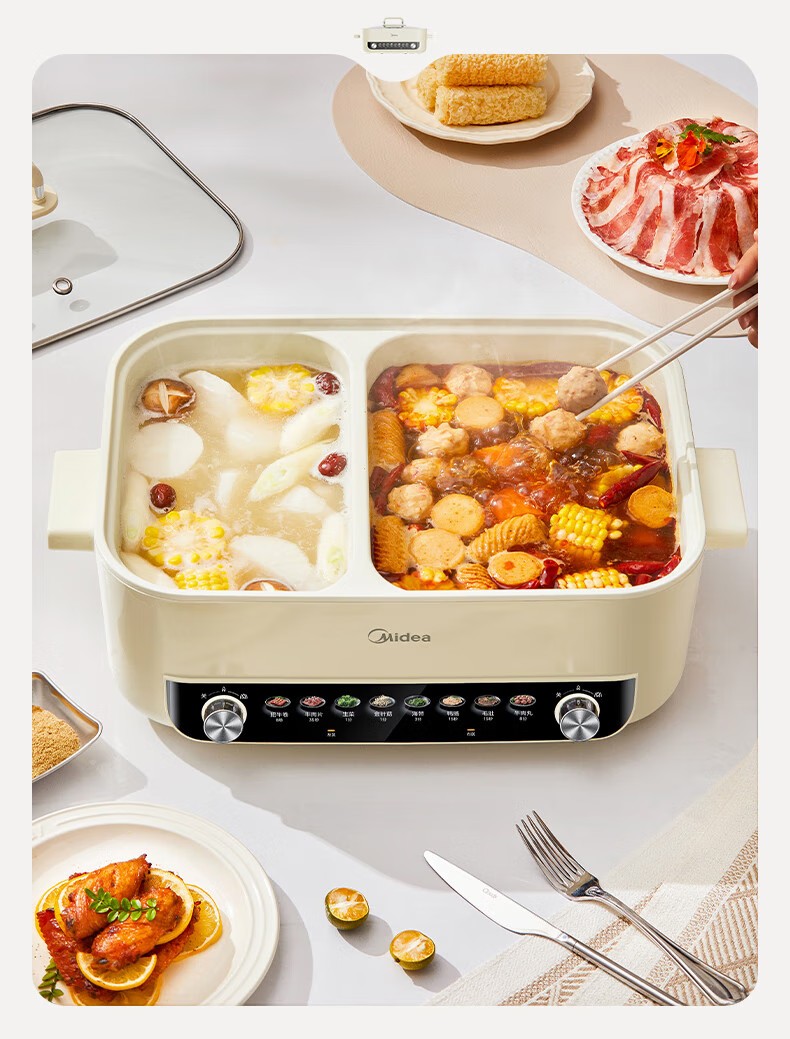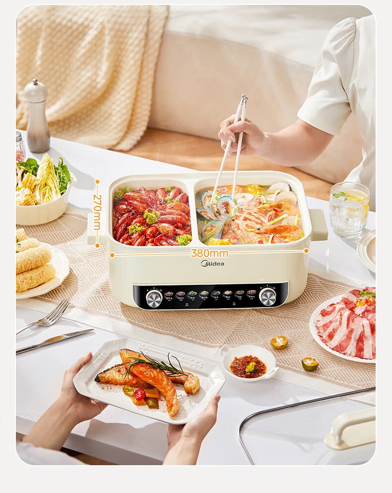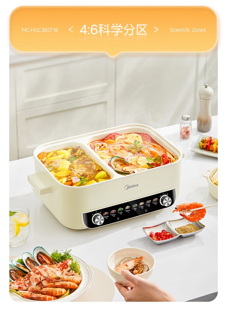 (巨邦佑)R+美的(Midea)电火锅 HGC382716 火锅专用锅四六鸳鸯锅电锅一体多功能锅家用电煮锅火锅锅分区控温 6.5L