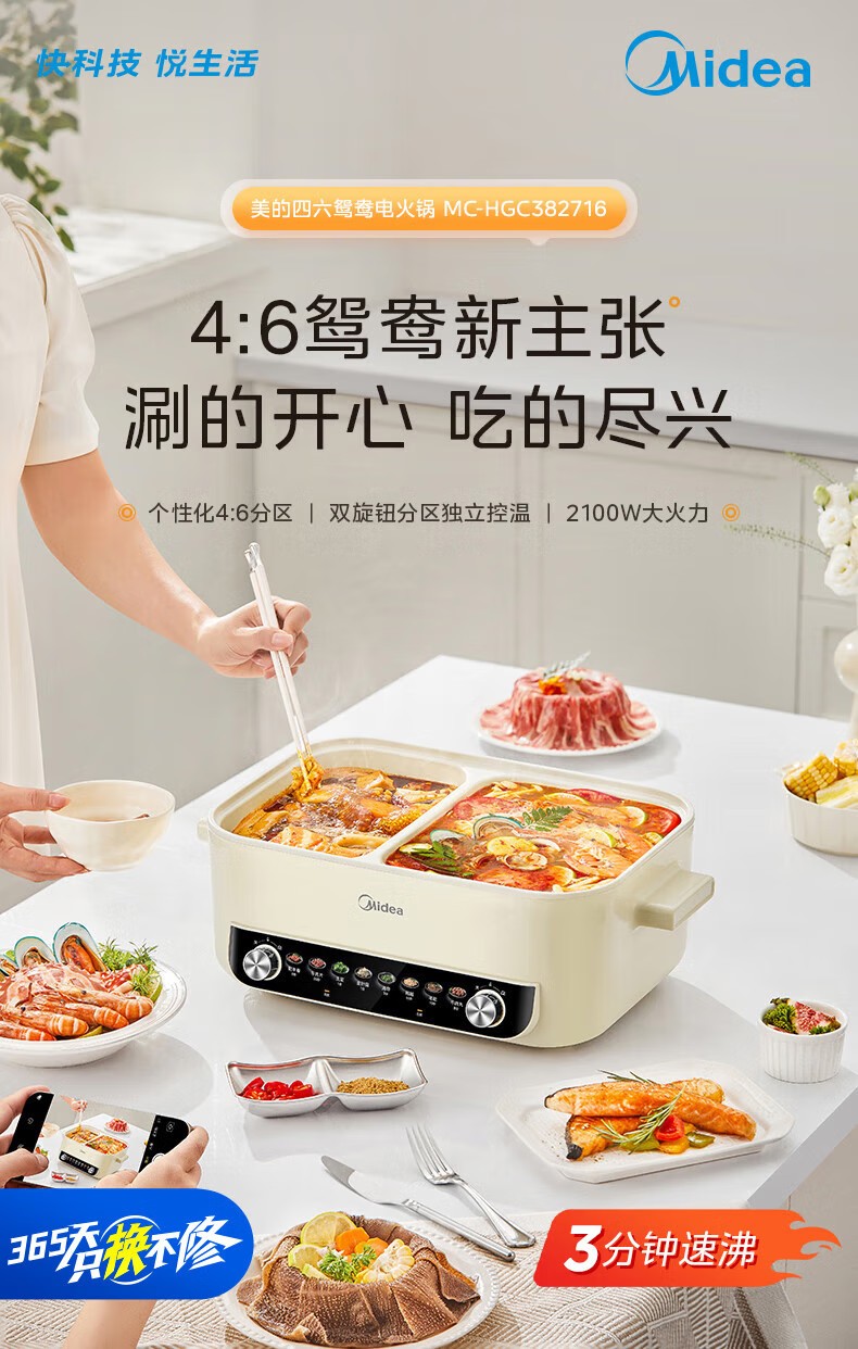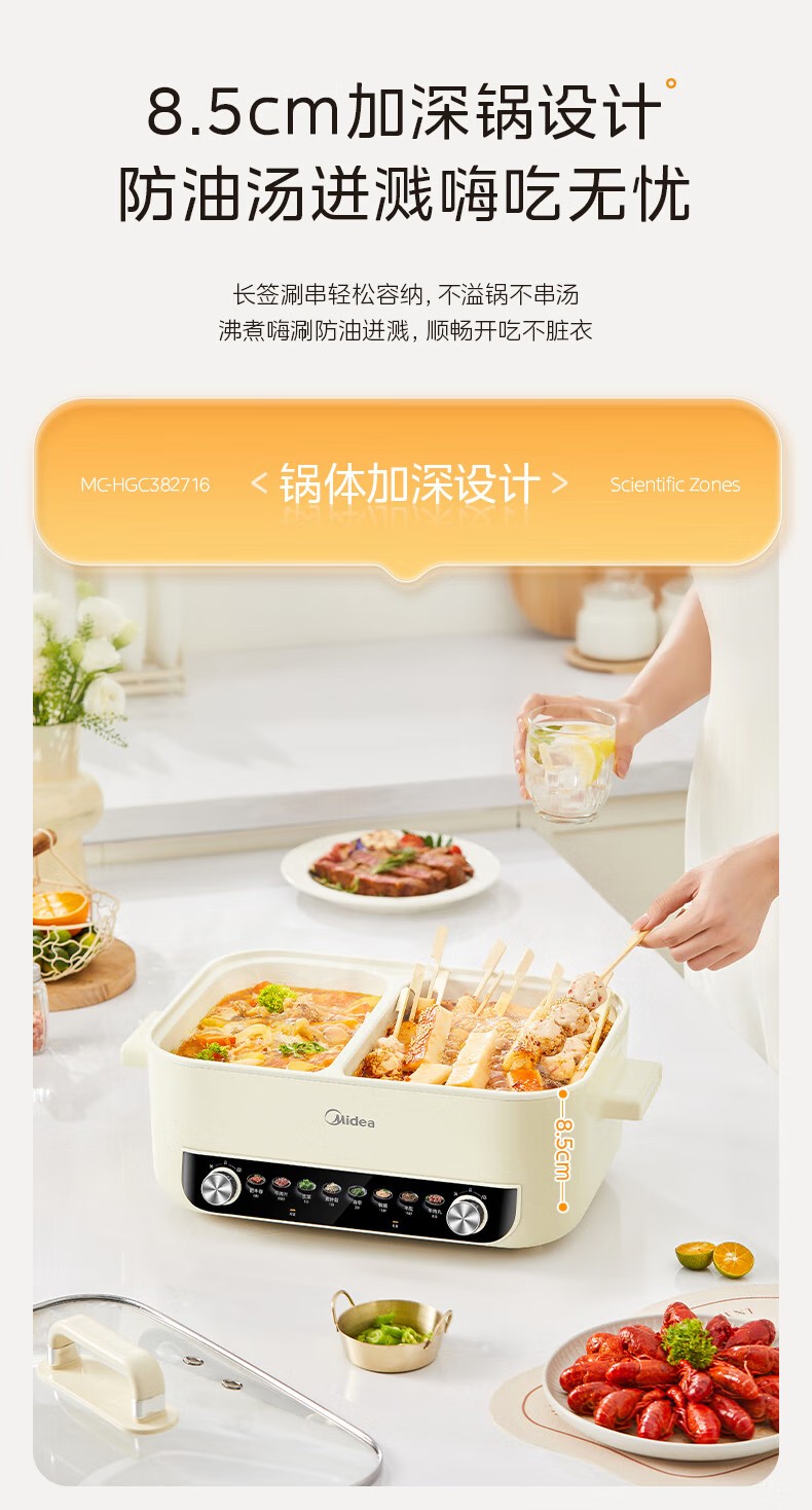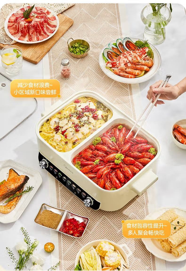 (巨邦佑)R+美的(Midea)电火锅 HGC382716 火锅专用锅四六鸳鸯锅电锅一体多功能锅家用电煮锅火锅锅分区控温 6.5L