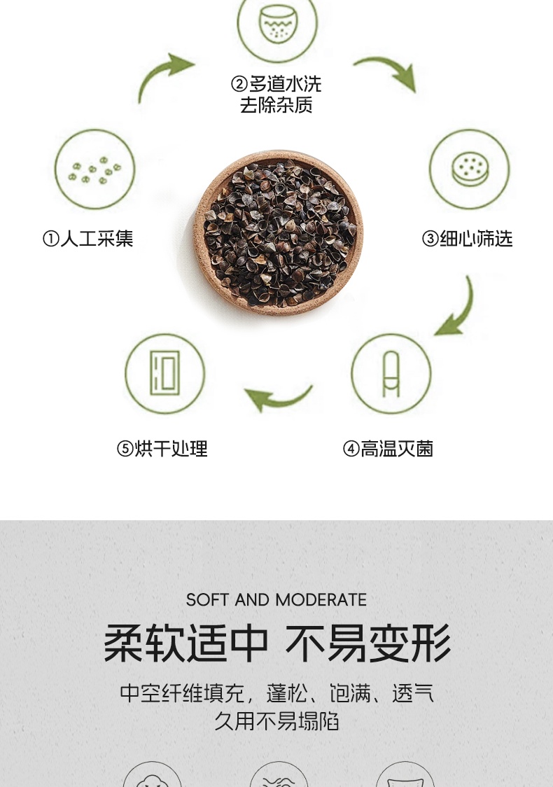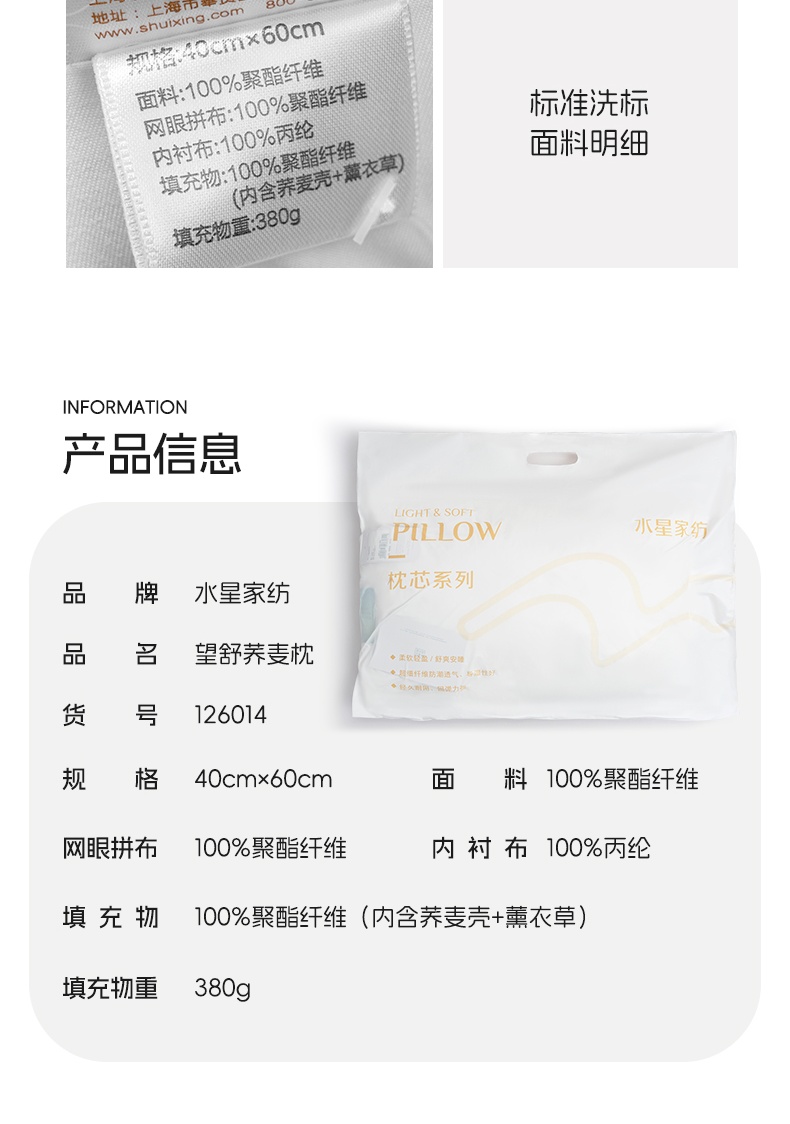 商品名称:(世星阳光)水星家纺 望舒荞麦枕 HN40cm×60cm 126014DH 面料100%聚酯纤维 内衬100%丙纶 填充物100%聚酯纤维(内含养麦壳+薰衣草) 草本枕 洁净舒适 抗菌防螨 蓬松自然 望舒荞麦枕
