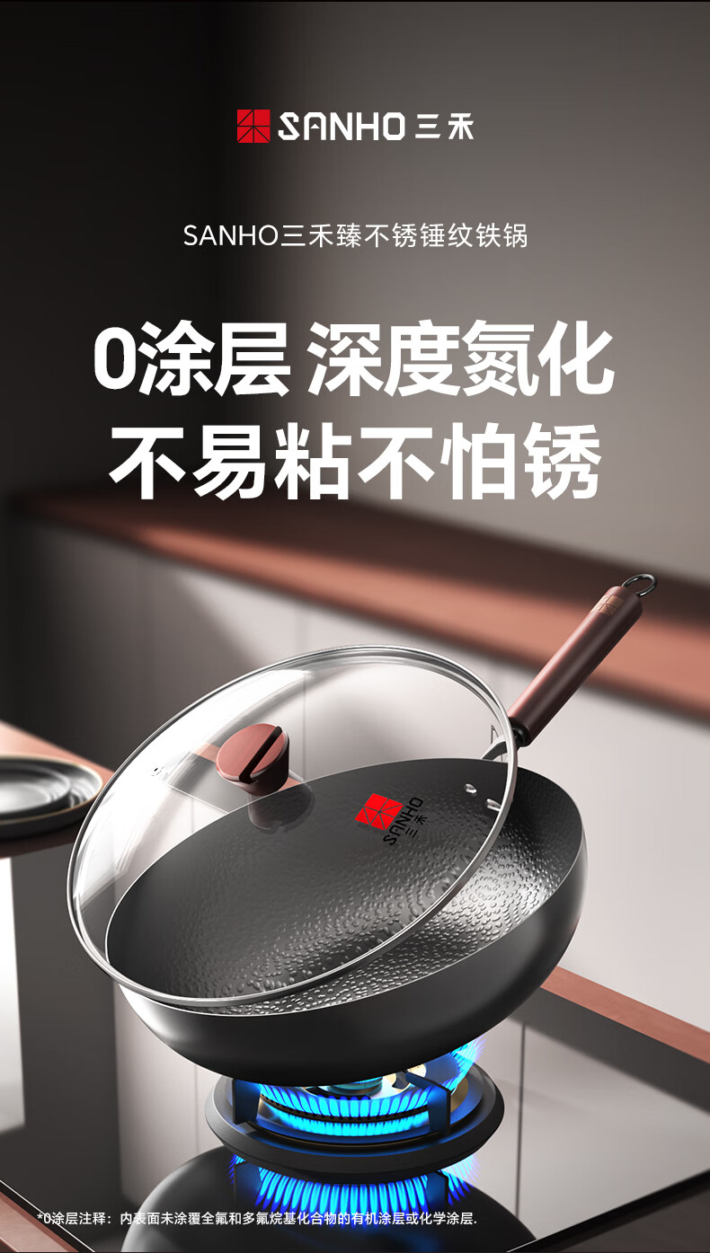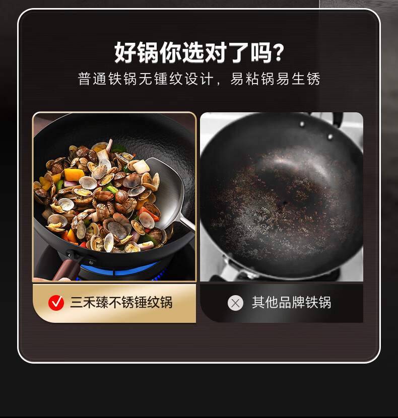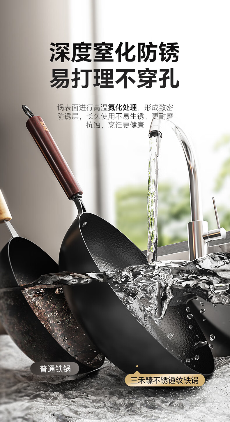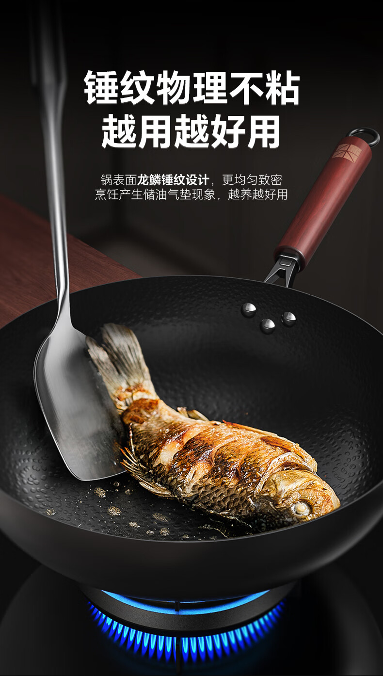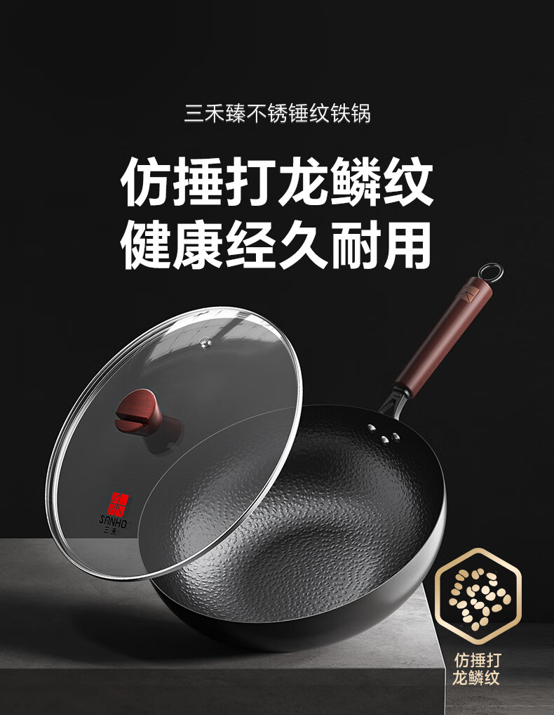 (巨邦佑)BJ+三禾臻不锈锤纹铁炒锅 32cm TC32P13无涂层物理不粘锅炒锅熟铁一体炒菜锅