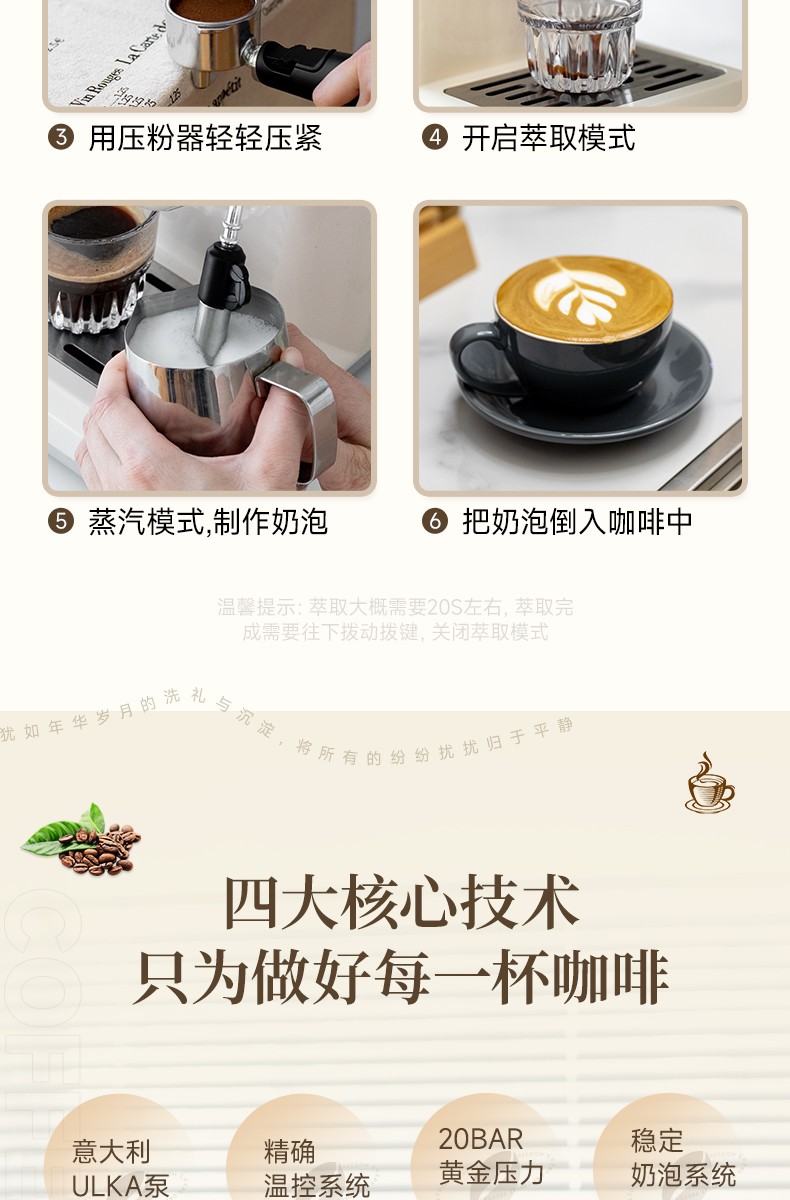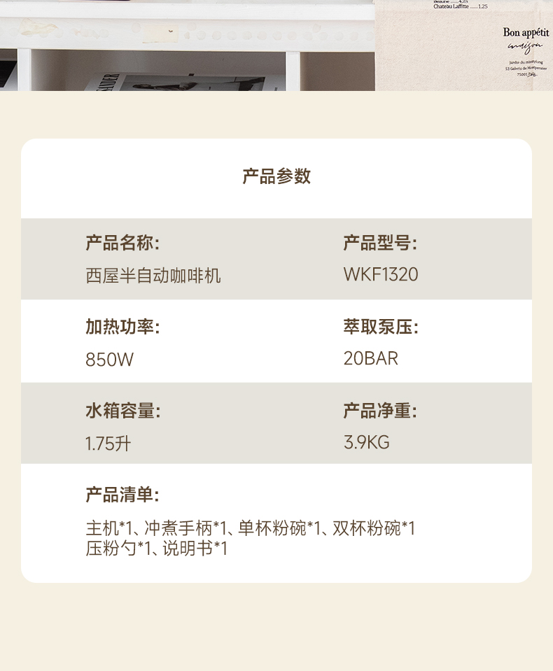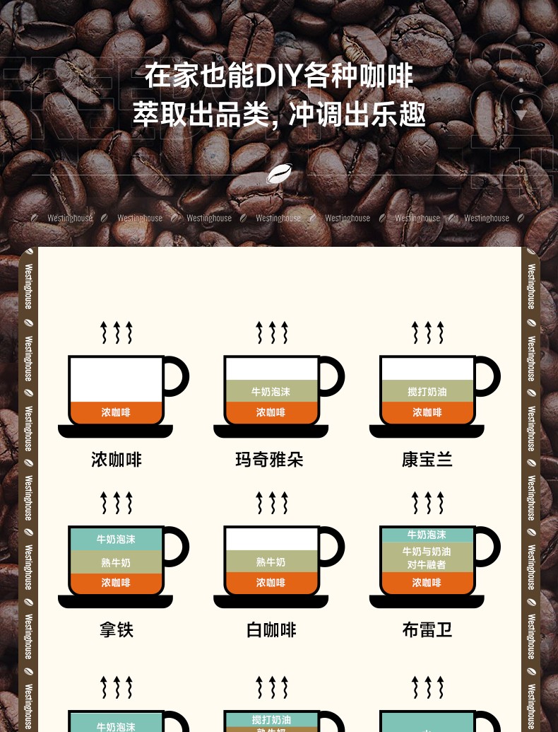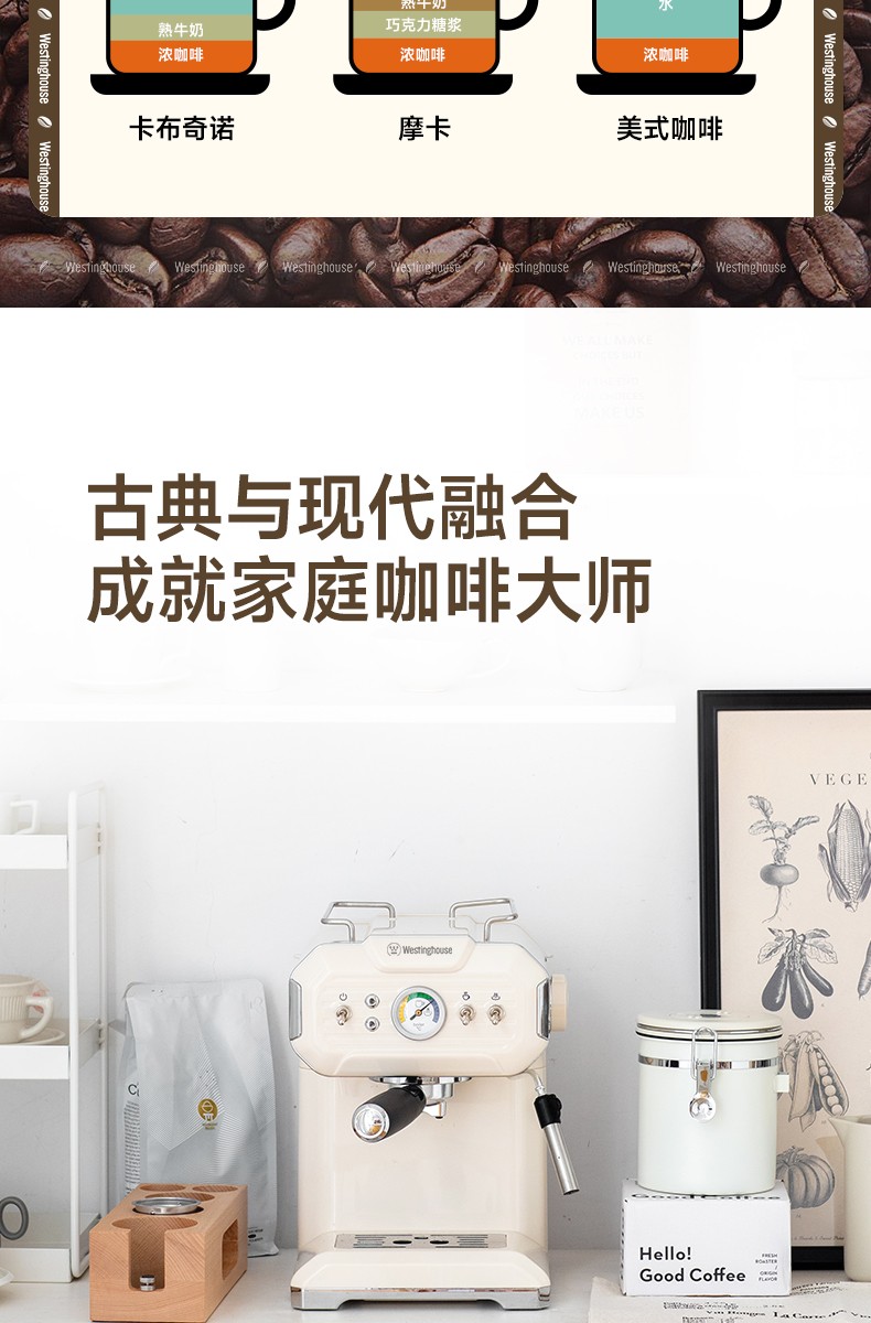 商品名称:(世星阳光)+WY西屋 咖啡机 1.8L WKF1320 萃取泵压 20BAR 意大利ULKA泵 精确温控系统 20BAR黄金压力 稳定奶泡系统