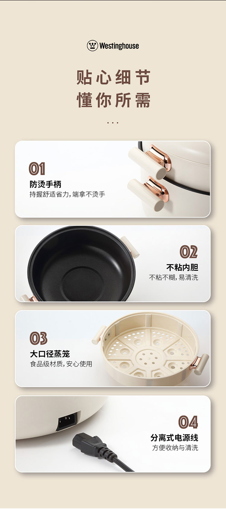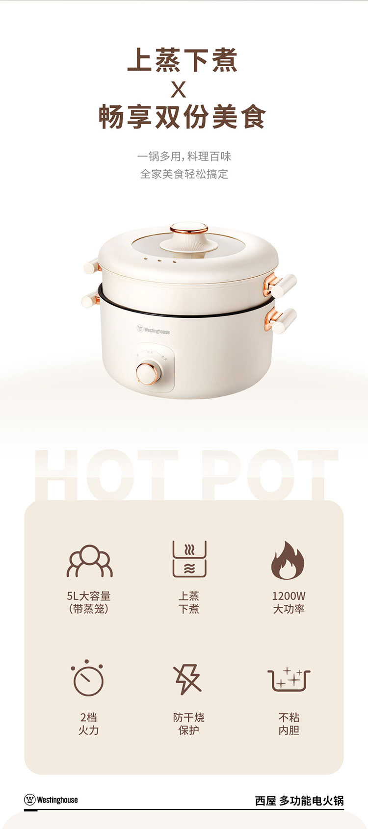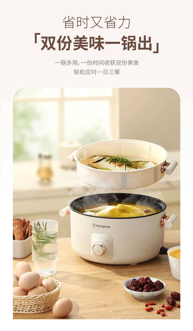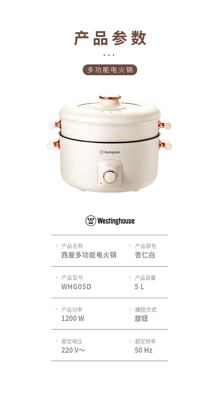 商品名称:(世星阳光)+WY西屋 多功能电火锅 5L WHG05D 大容量 带蒸笼 一锅多能 上蒸下煮