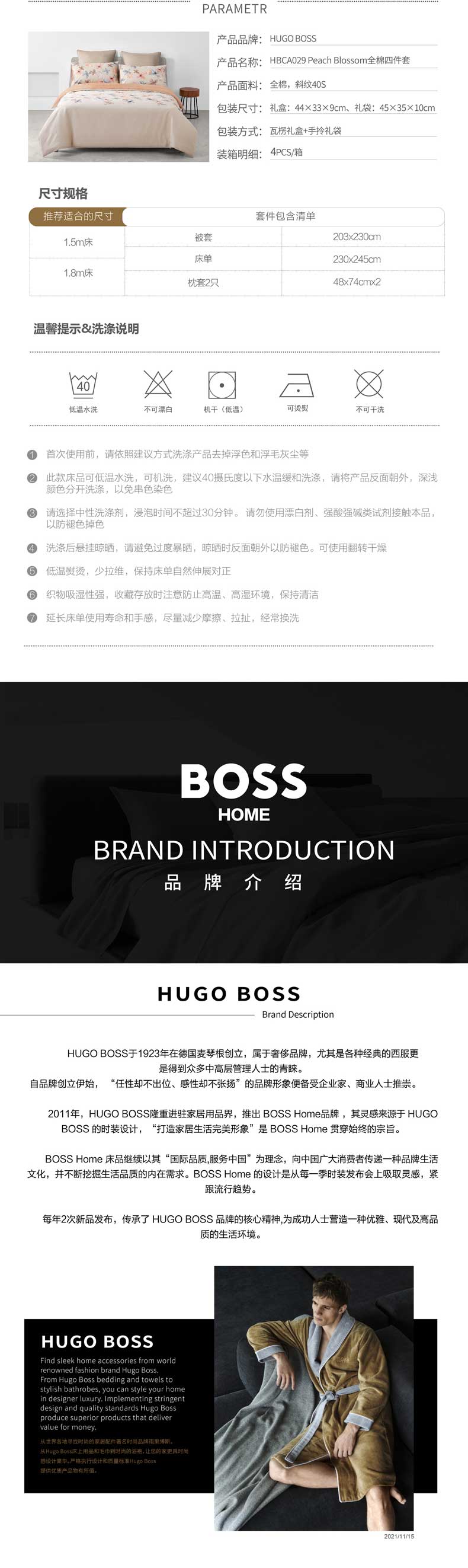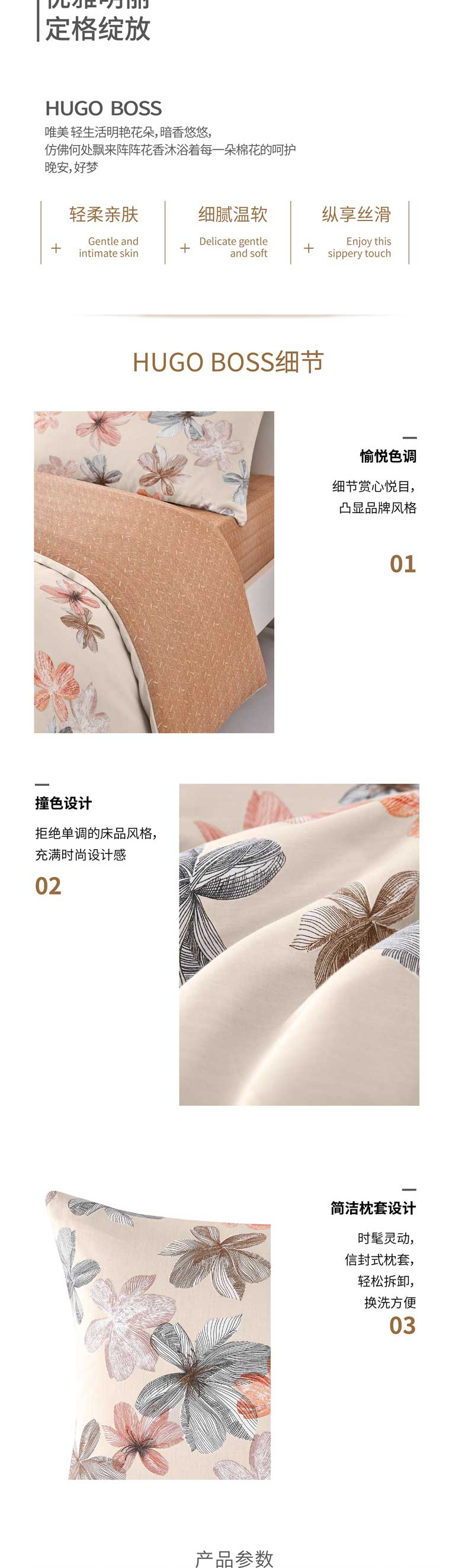 商品名称:(世星阳光)+ HUGO BOSS 全棉四件套 203×230cm 采用优良的斜纹全棉面料