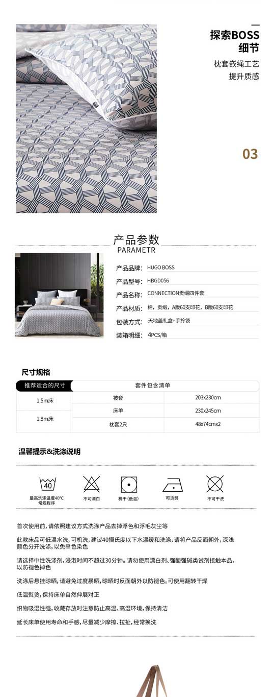 商品名称:(世星阳光)+ HUGO BOSS 贡缎四件套203×230cm 内附7根绑带 固定被芯不移位