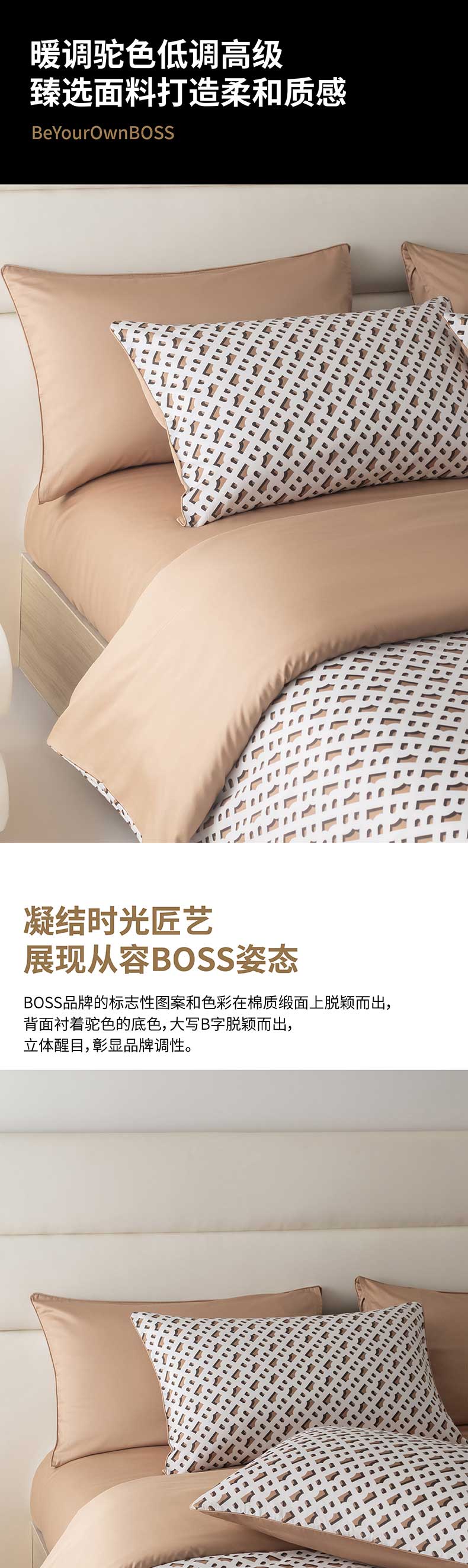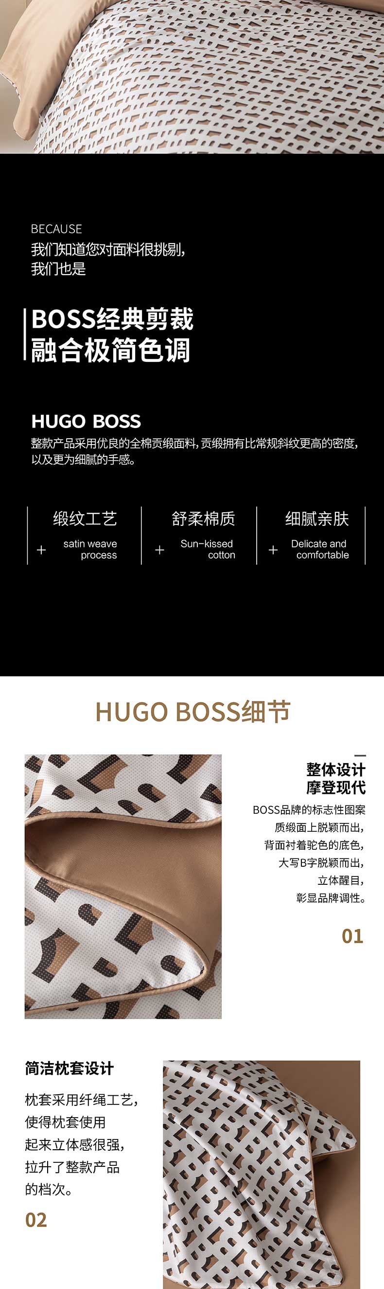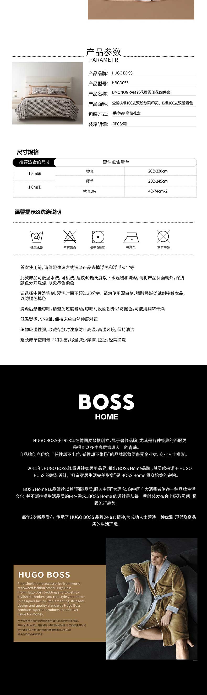 商品名称:(世星阳光)+ HUGO BOSS 老花贡缎印花四件套 203×230cm 采用优良的全棉贡缎面料更高的密度