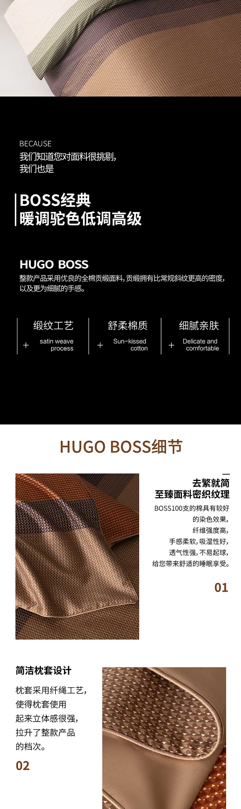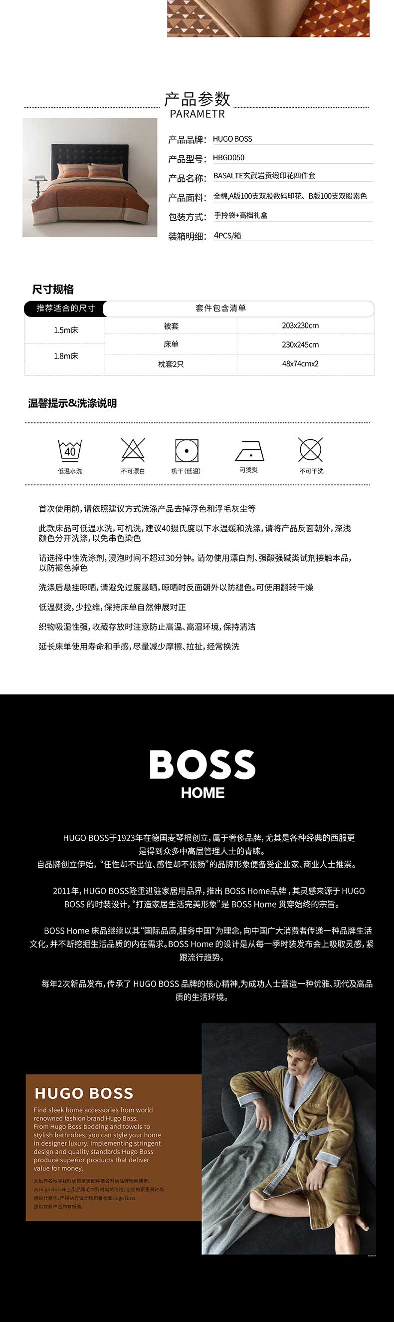 商品名称:(世星阳光)+ HUGO BOSS 玄武岩贡缎印花四件套 203×230cm 采用优良的全棉贡缎面料 拥有比常规斜纹更高的密度 双面可用