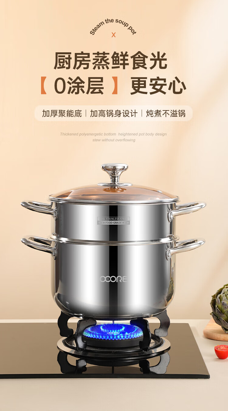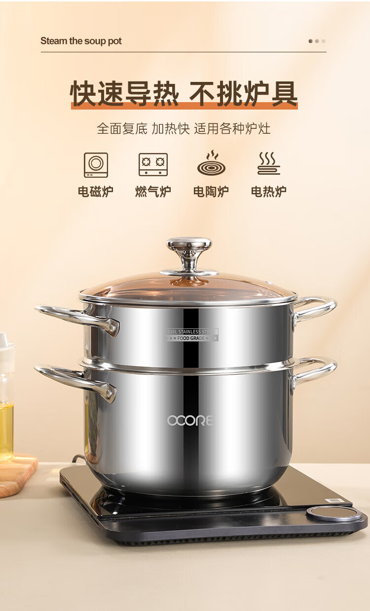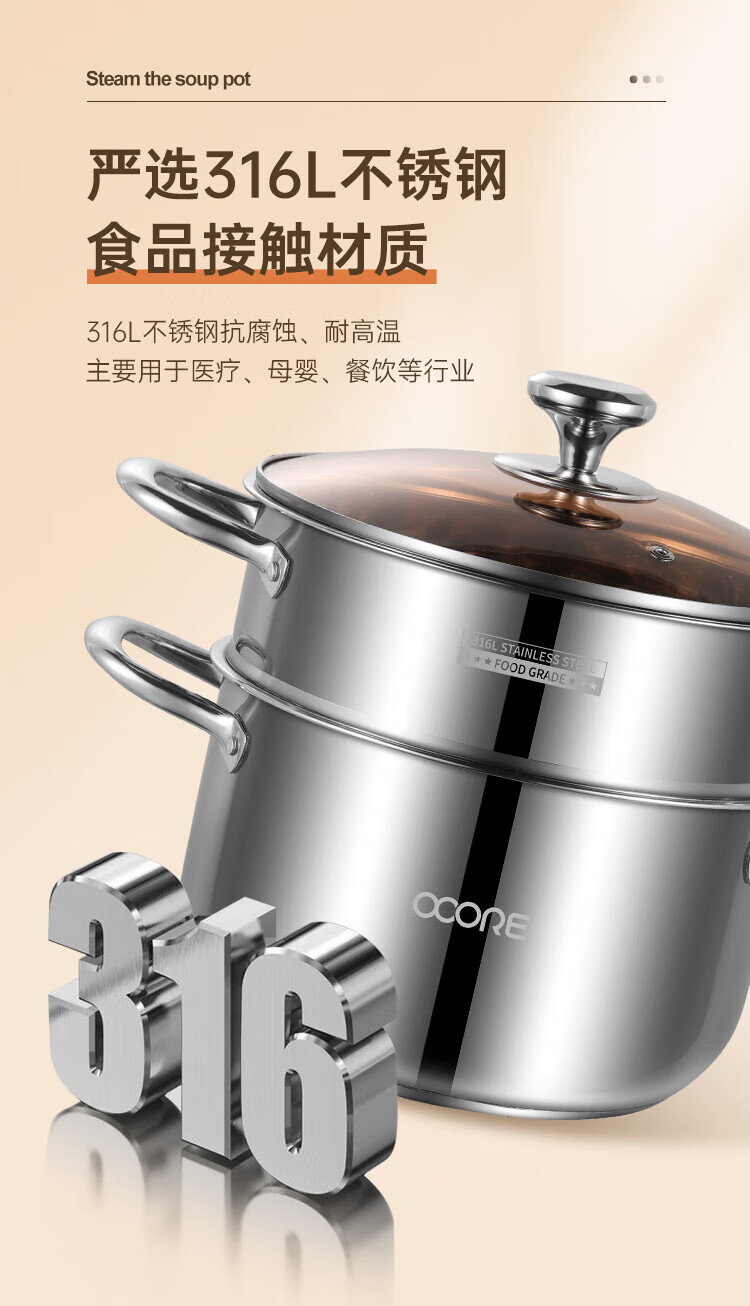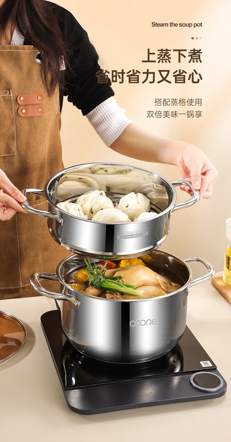 (巨邦佑)BJ+物芯质造316L特高炖汤锅24cm Smart全钢弧形汤蒸锅带蒸格 蒸煮同步加厚3层钢不挑炉灶