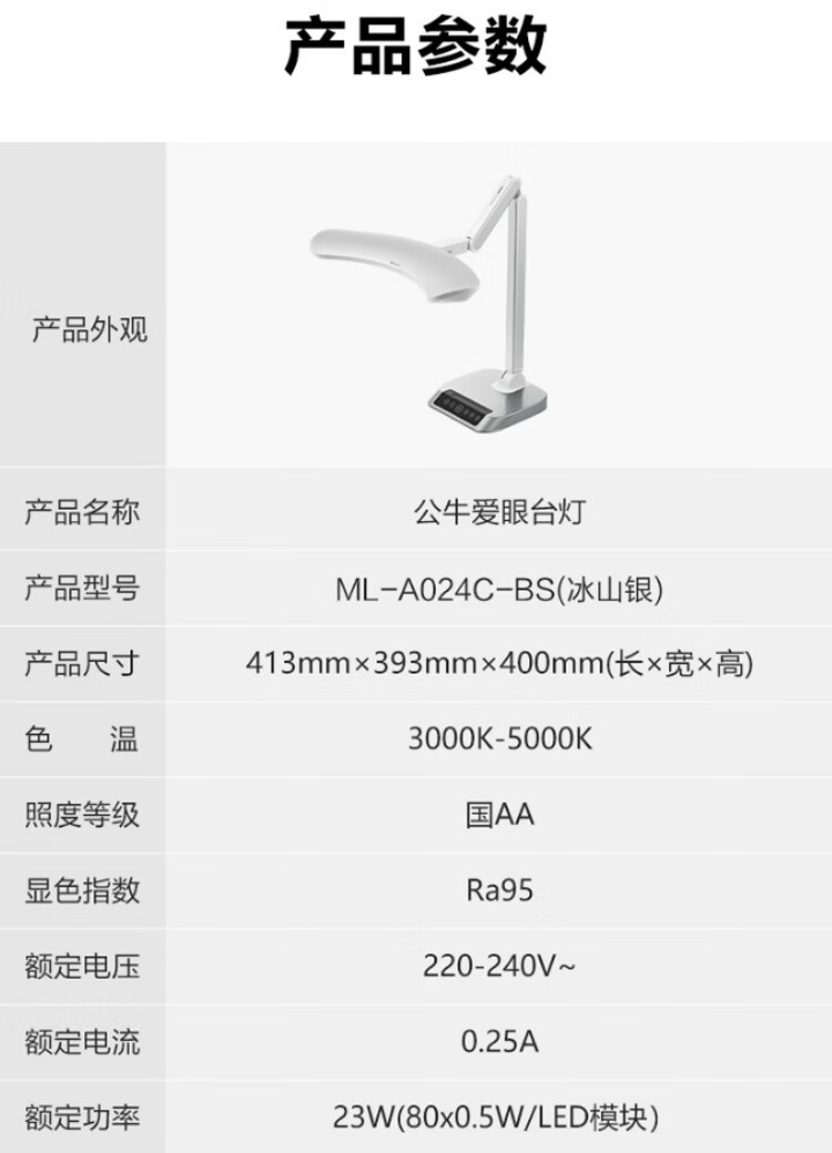 商品名称:(巨邦佑)BJ+公牛(BULL)公牛爱眼台灯 ML-A024C-BS 冰山银23W LED灯源护眼防蓝光 无极调光