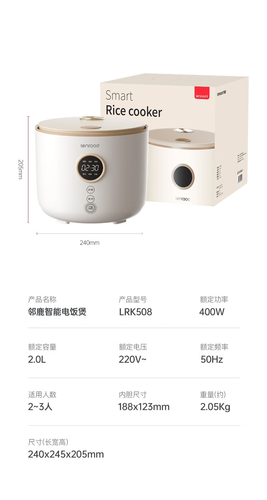 商品名称:(巨邦佑)BJ+邻鹿 智能电饭煲 2L LRK-508 智能迷你小型家用饭煲触摸操控12H可预约7种菜单多功能