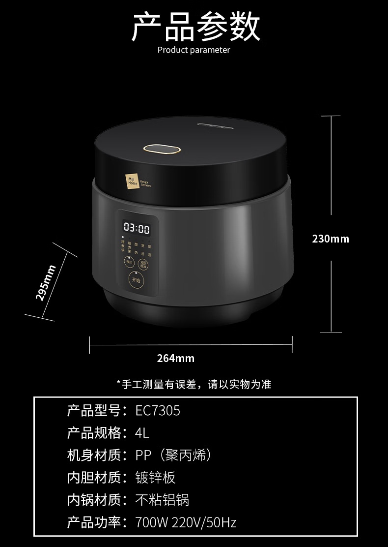 商品名称:(世星阳光)+米技(MIJI)电饭煲家用4L多功能电饭锅 EC7305 MIJI HOME 4L 一键式开盖 轻松操作防腐蚀 抗磨损大按键 一键式开启按钮易于单手操作 大面板智能操控 集多种功能于一身