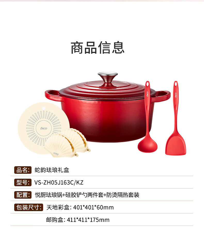 商品名称:(巨邦佑)BJ+康宁 蛇韵珐琅礼盒三件组礼盒 多功能铸铁珐琅锅+硅胶铲勺2件组+防烫隔热套装