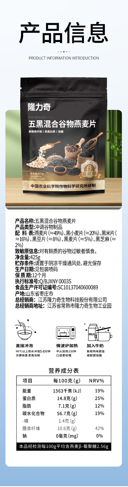 商品名称:(巨邦佑)BJ+隆力奇 五黑混合谷物燕麦片425g*3袋 高膳食纤维高蛋白低糖