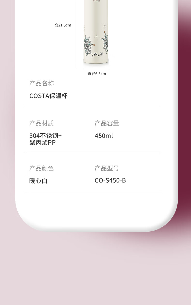 商品名称:(巨邦佑)BJ+COSTA 保温杯 450ml CO-S450-B 304不锈钢高效保温保冷