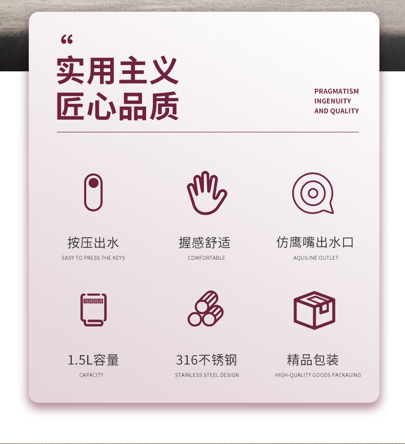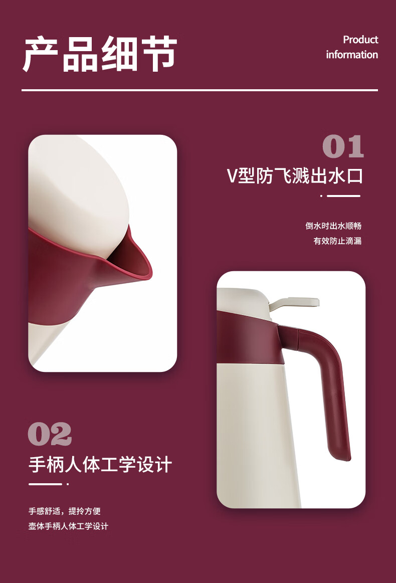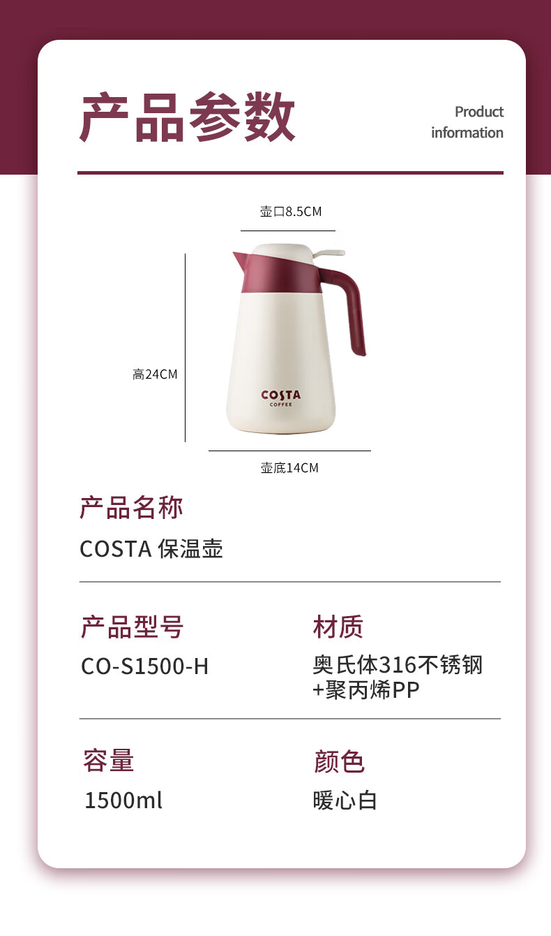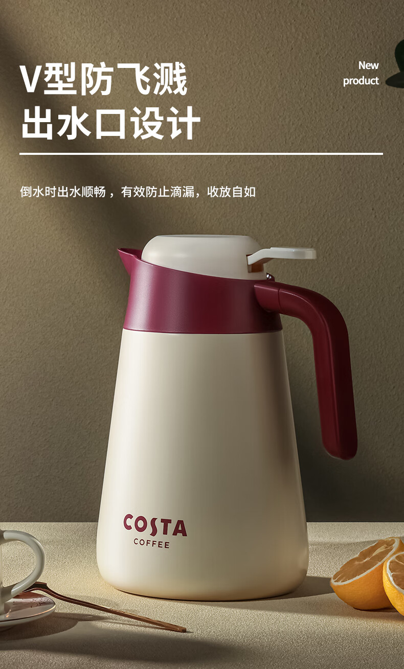 商品名称:(巨邦佑)BJ+COSTA 保温壶 1500ml CO-S1500-H 大容量V型防飞溅出水口316不锈钢食品级