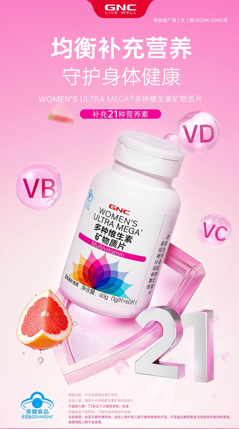 (世星阳光)GNC健安喜 WOMEN\S ULTRAMEGA 多种维生素矿物质片60片 女士 微囊化包埋技术 锁住营养不流失 维生素A采用DSM进口原料 蓝帽认证 品质之选
