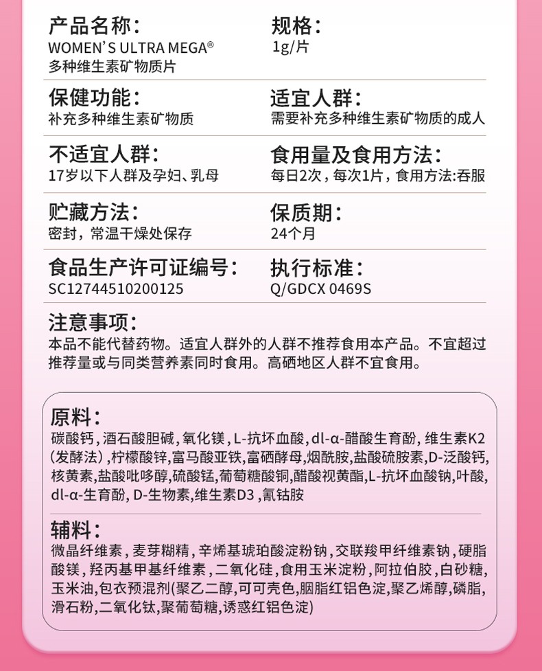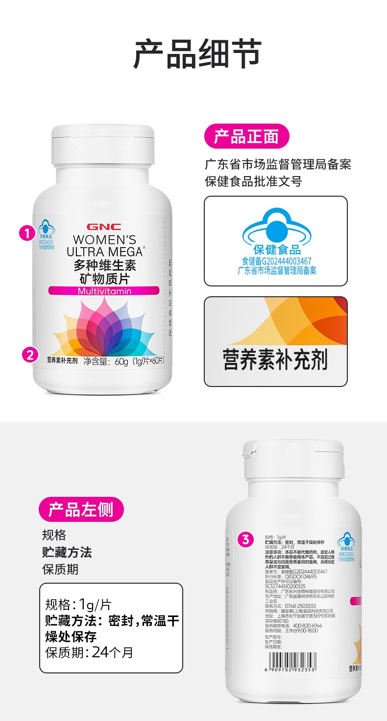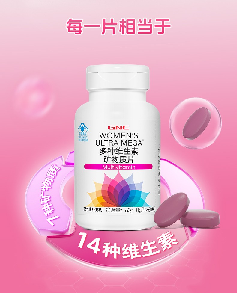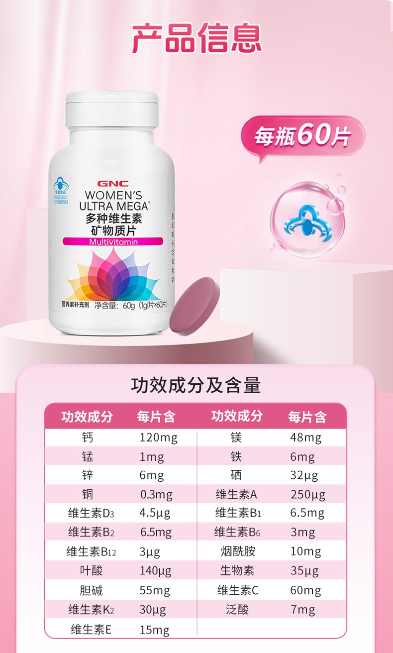 商品名称:(世星阳光)GNC健安喜 WOMEN\S ULTRAMEGA 多种维生素矿物质片60片 女士 微囊化包埋技术 锁住营养不流失 维生素A采用DSM进口原料 蓝帽认证 品质之选