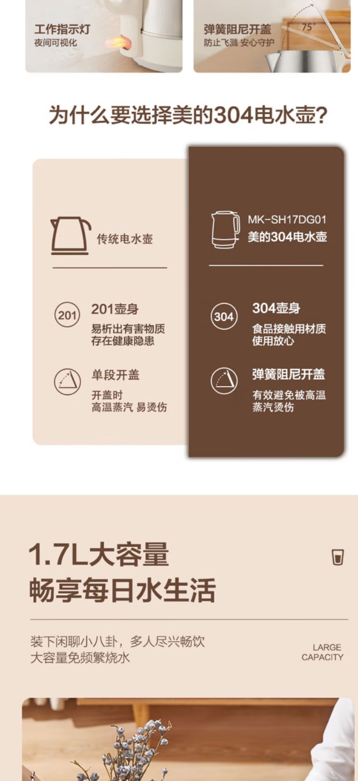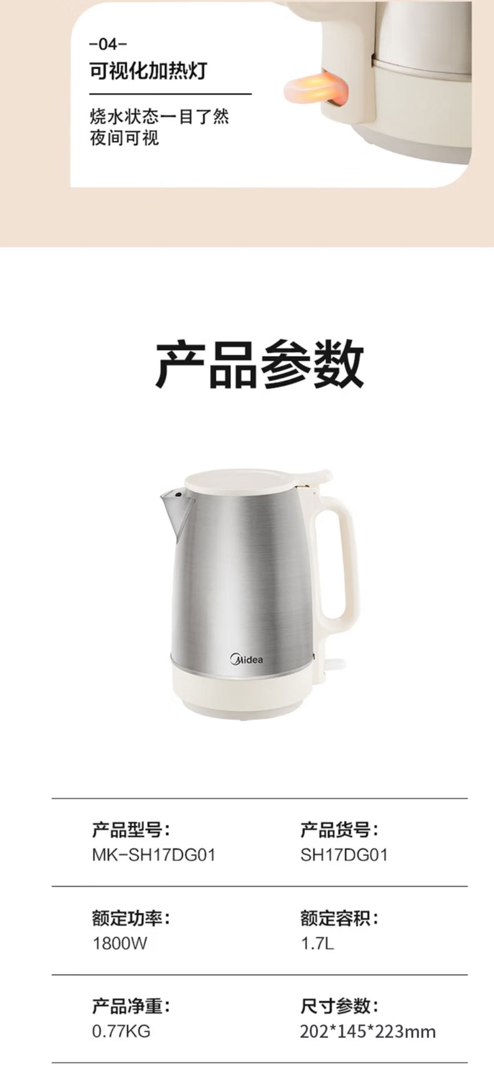 商品名称:(世星阳光)美的1.7L 电水壶 SH17DG01 304不锈钢 弹簧阻尼开盖