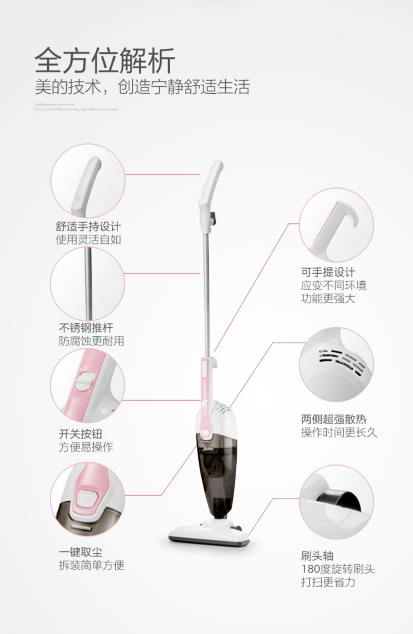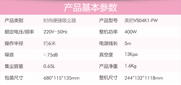 商品名称:(世星阳光)美的 吸尘器 0.4L VS04K1-FW 家用吸尘器 手持立式 有线吸尘器 强劲吸力 360°旋转地刷 易收纳两用大吸力