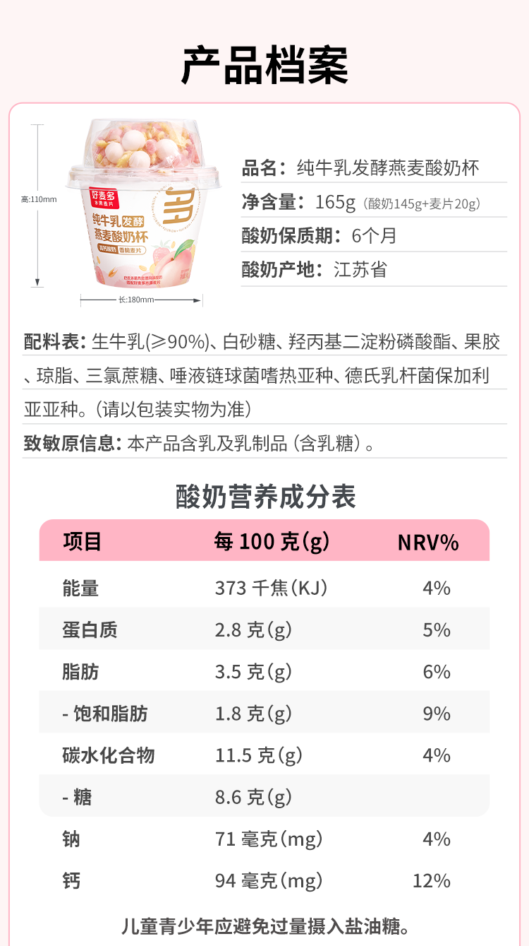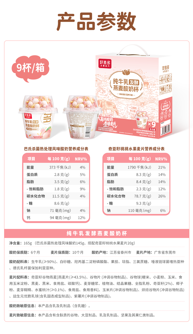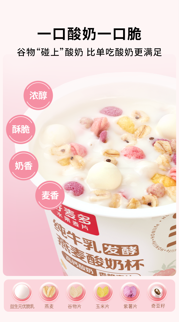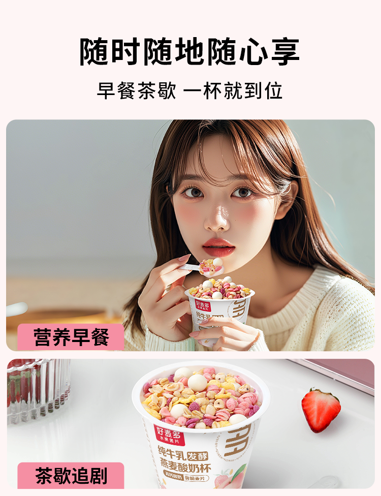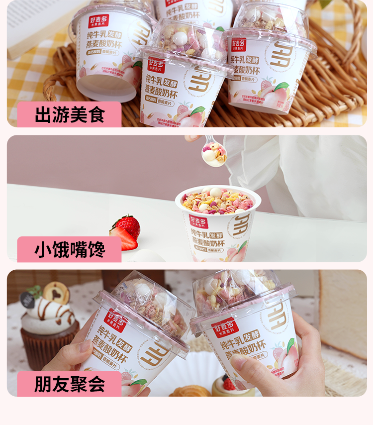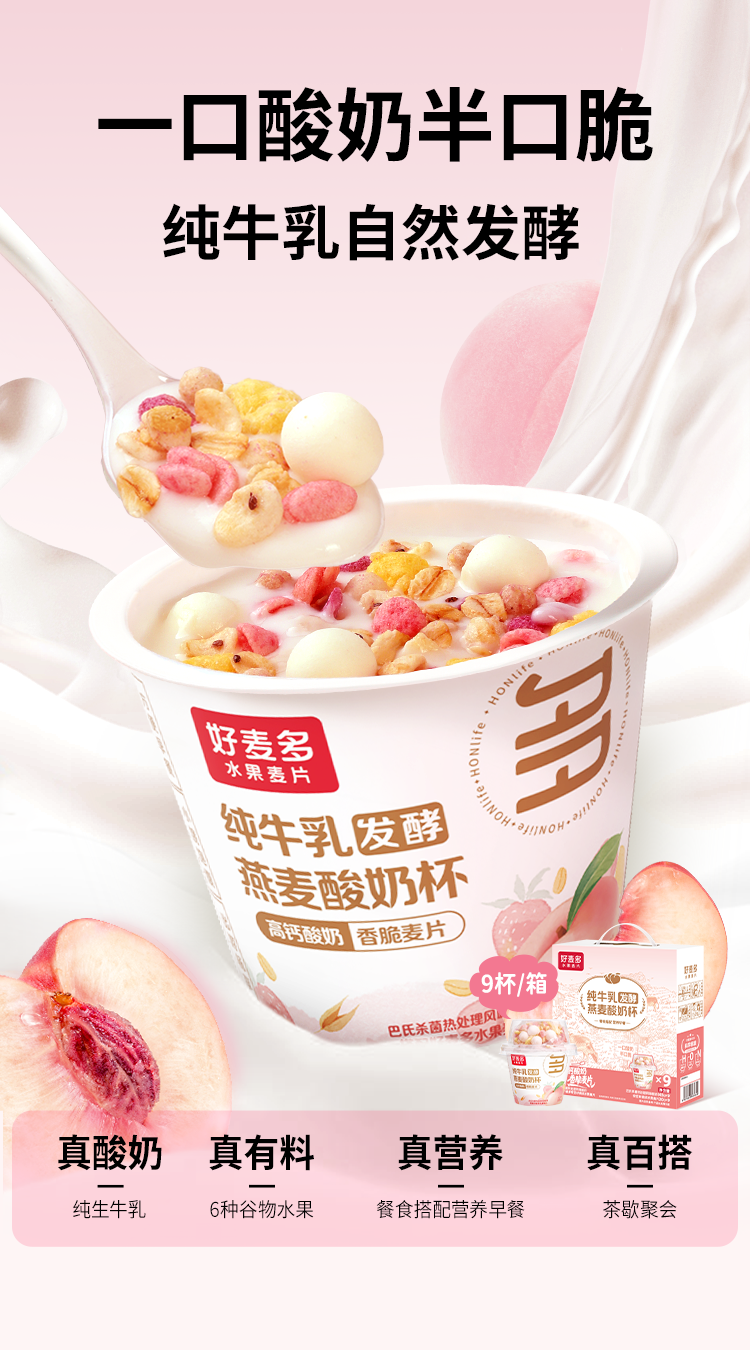 商品名称:(巨邦佑)T+ (yp)好麦多燕麦搅拌酸奶碗杯懒人早餐 下午茶 开盖即食营养代餐咀嚼零食 桃桃味165g*9杯