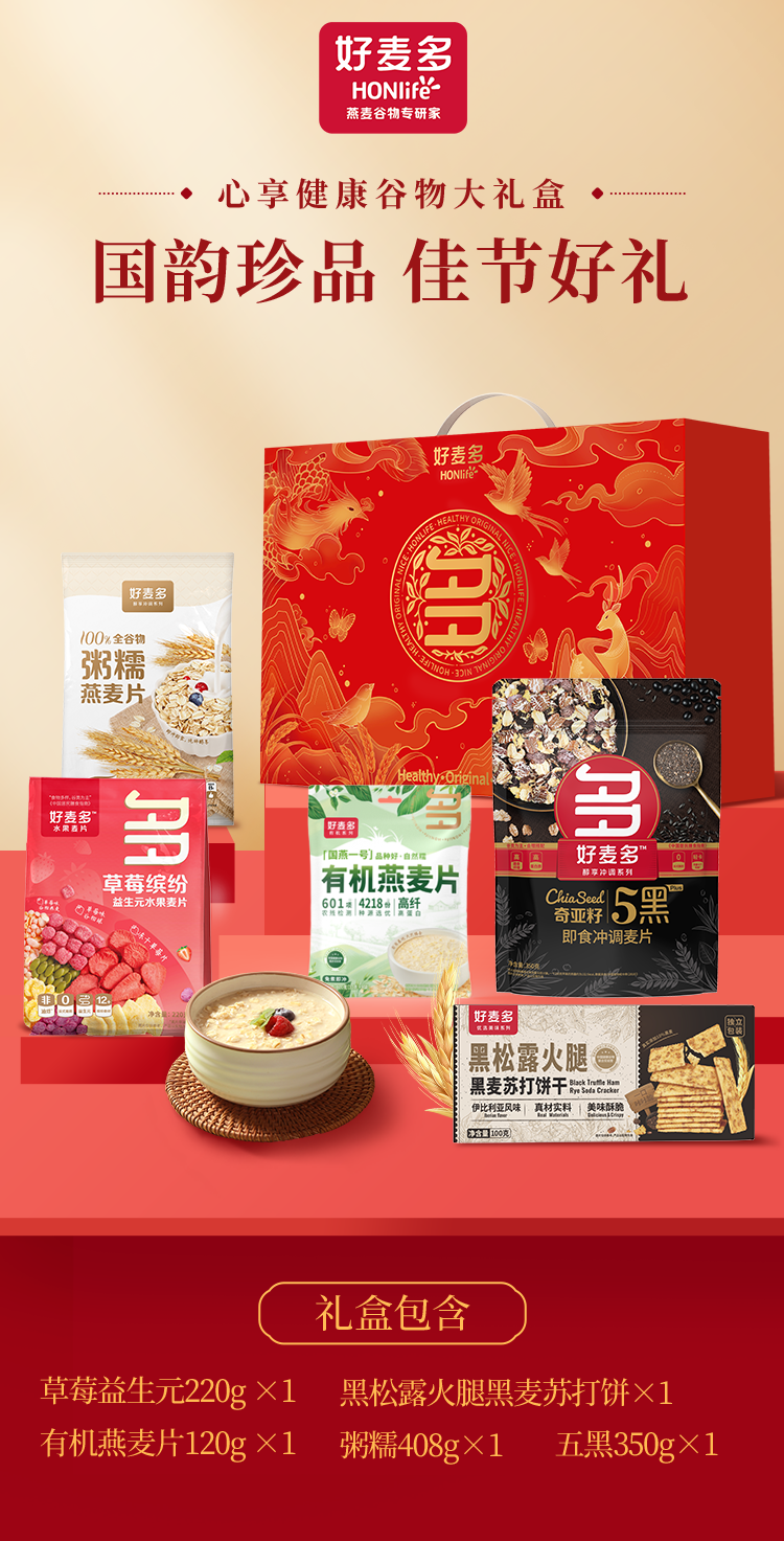商品名称:(巨邦佑)T+ (yp)好麦多奇亚籽燕麦片独立包装营养养生早餐即食送礼长辈父母家长礼盒 心享健康谷物大礼盒1198g