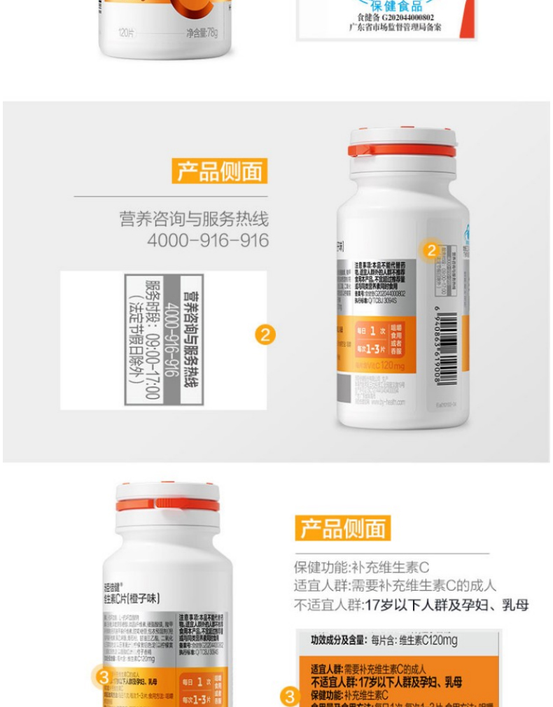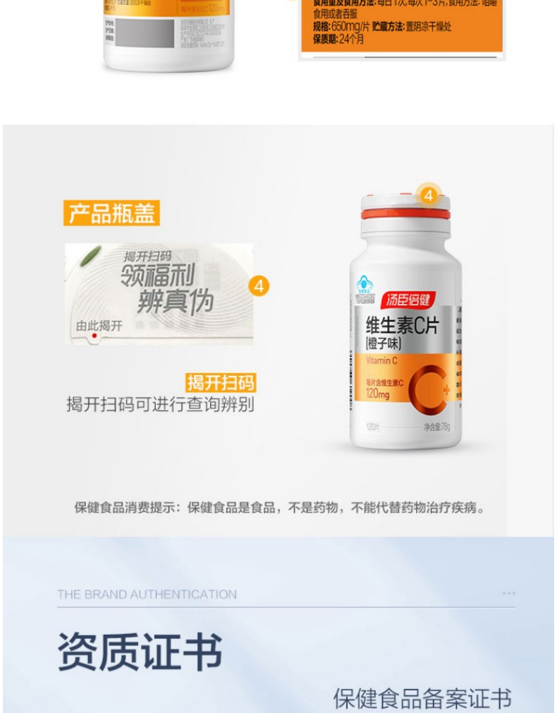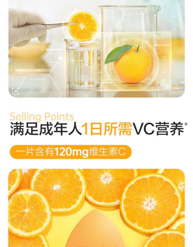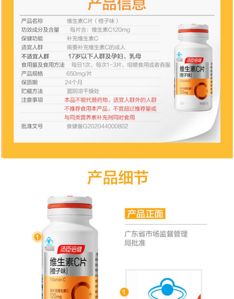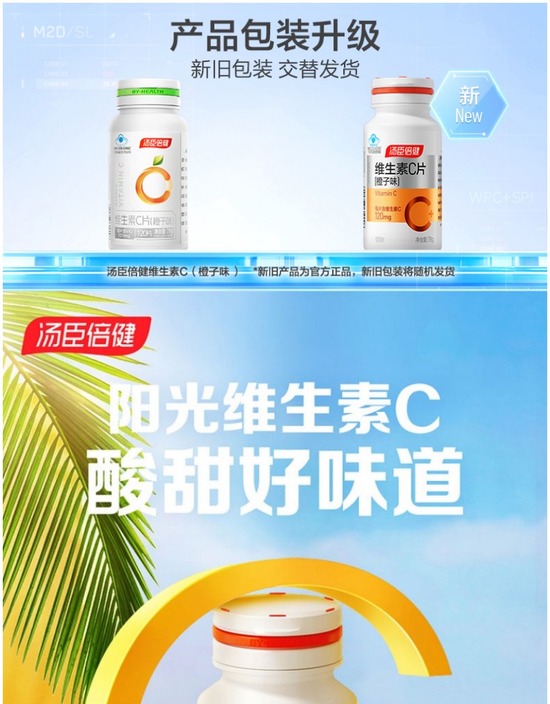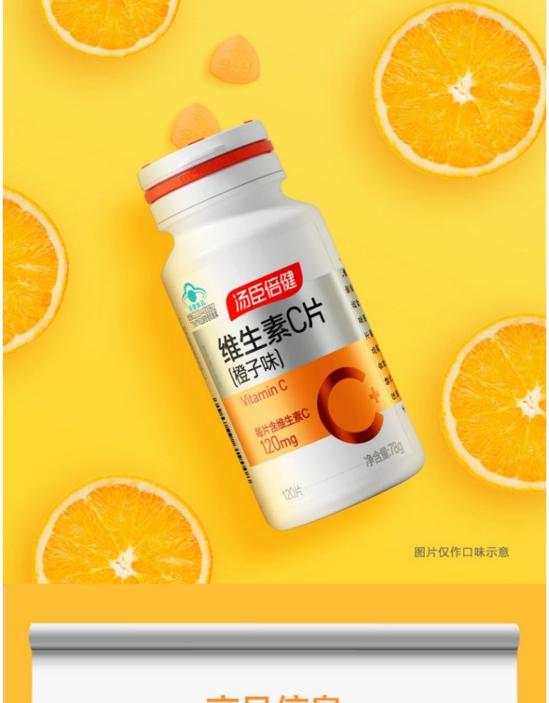 商品名称:(世星阳光)汤臣倍健 维生素C片橙子味120片 阳光维生素C 酸甜好味道 满足成年人1日所需VC营养 一片含有120mg维生素C