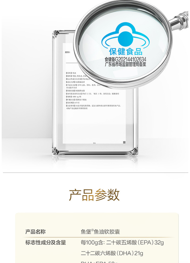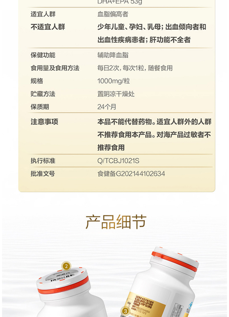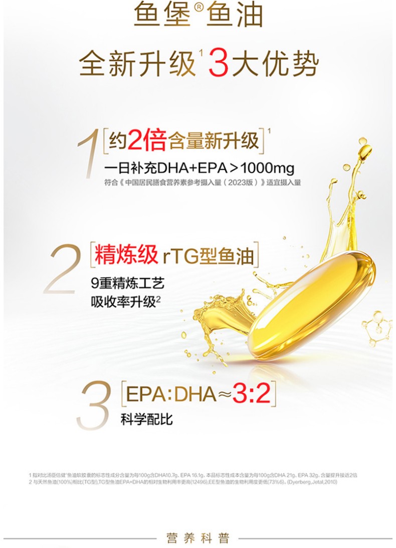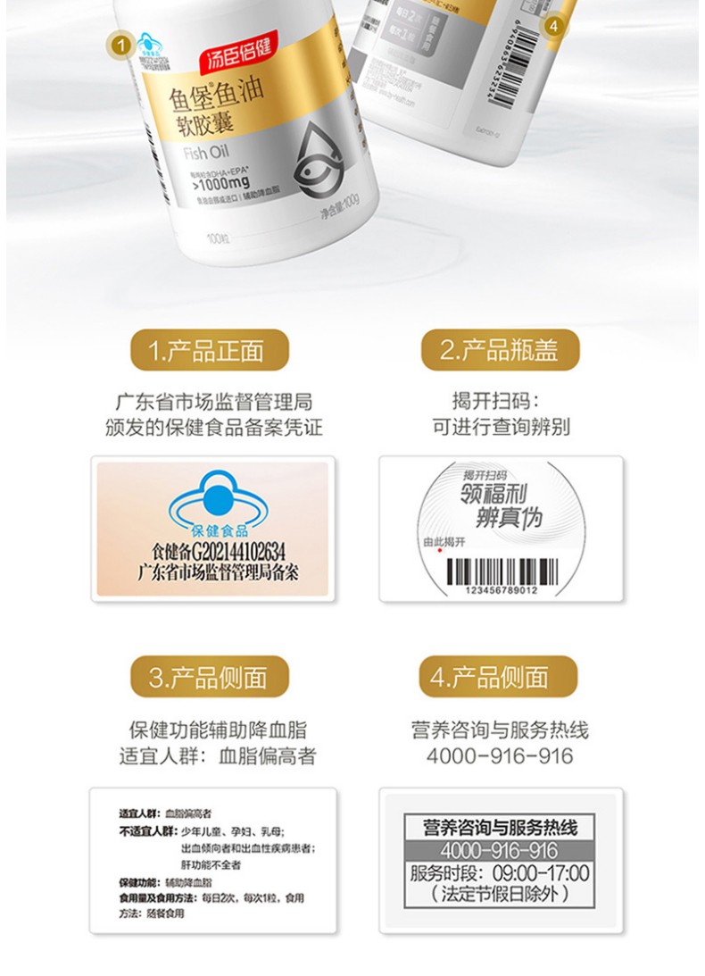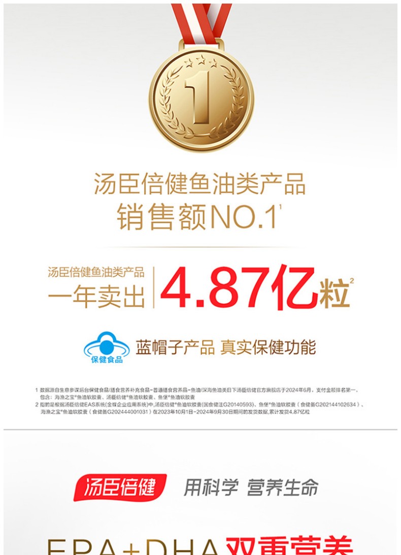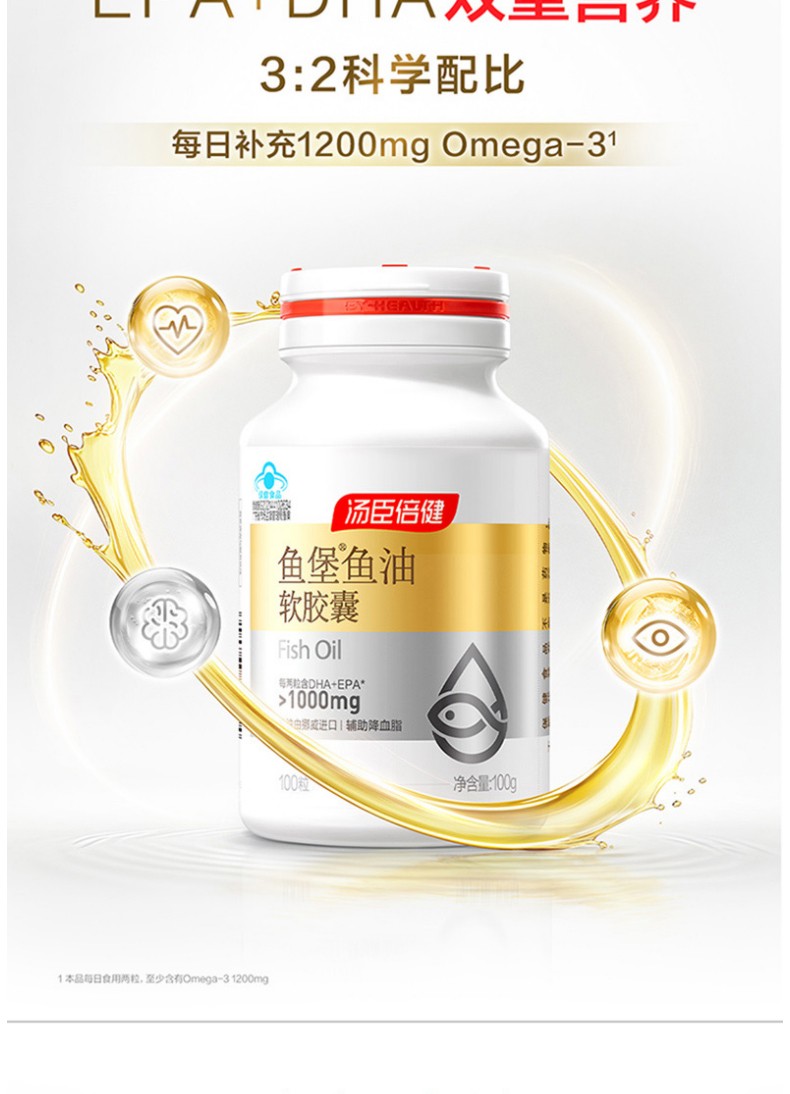 商品名称:(世星阳光)汤臣倍健 鱼堡鱼油软胶囊100粒 EPA+DHA双重营养 约2倍含量新升级 精炼级rTG型鱼油 有助于减少油脂沉积 显著降低甘油三酯 润泽双眸