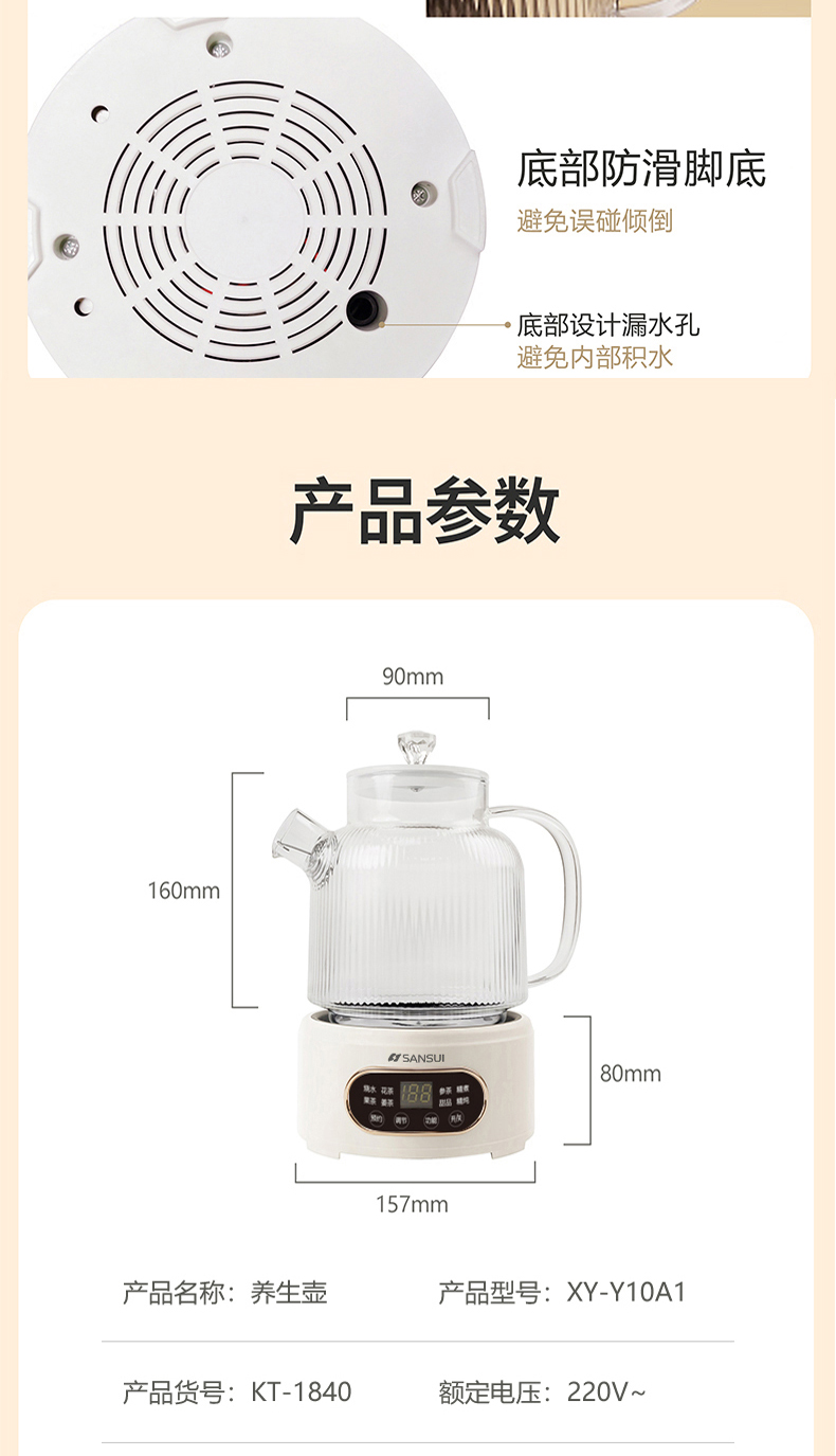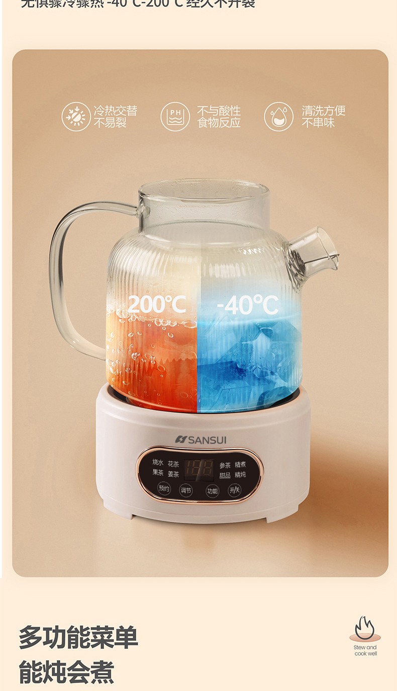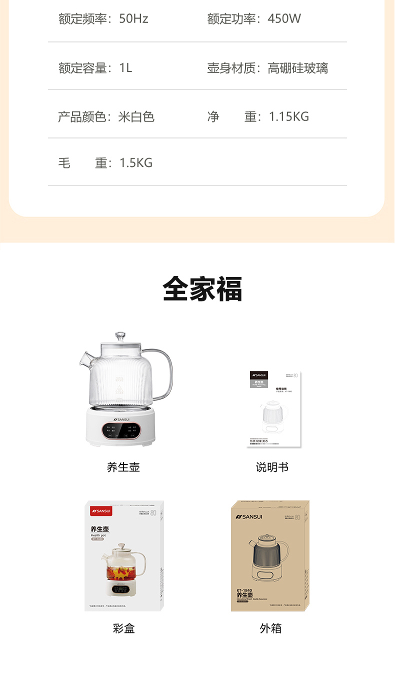 商品名称:(世星阳光)SANSUI山水 智能分体养生壶1L 白色 KT-1840 全玻璃养生多段炖煮 准确控温 健康煮水分体式玻璃壶 全玻璃壶身 无异味 无水垢 无糊底