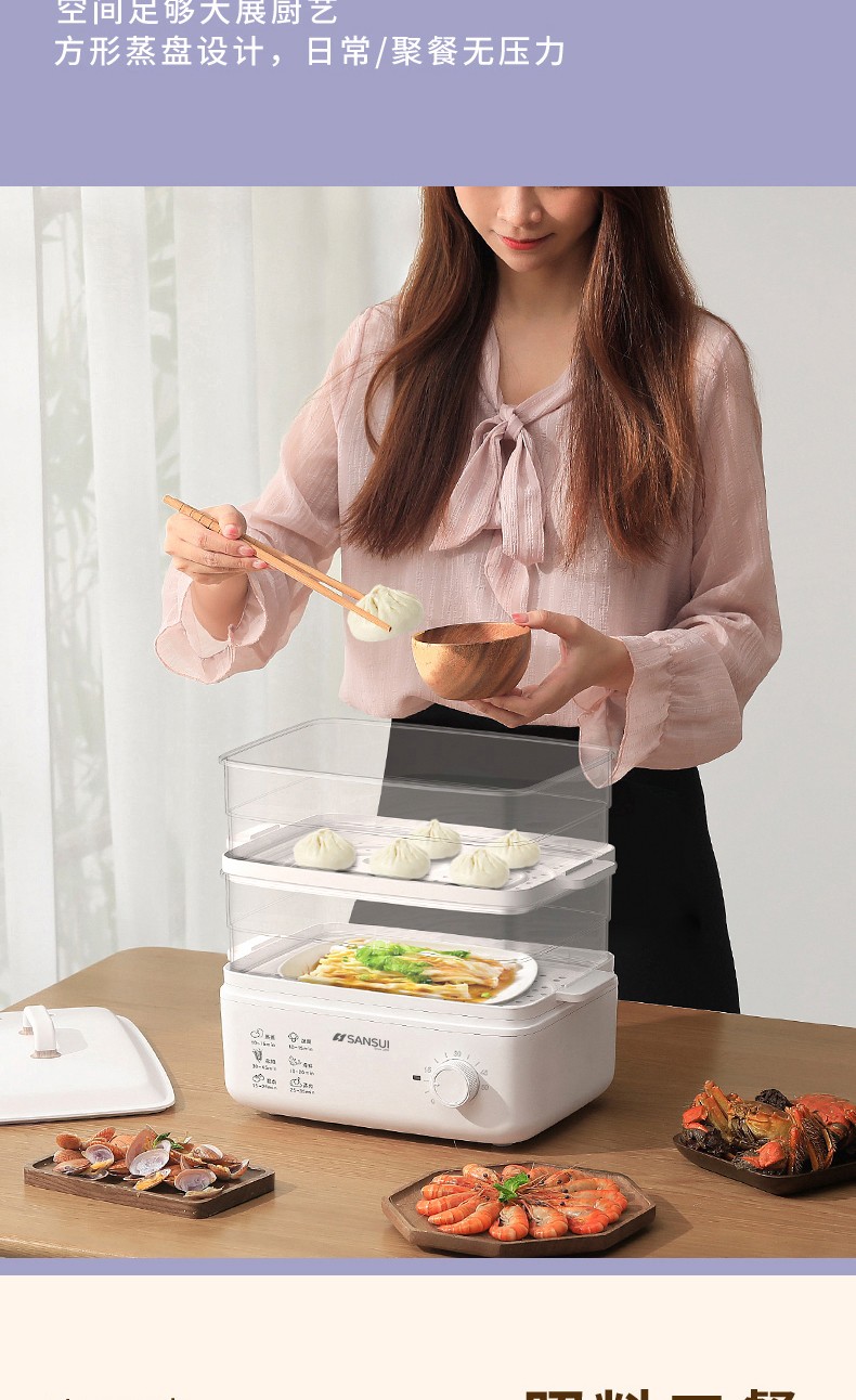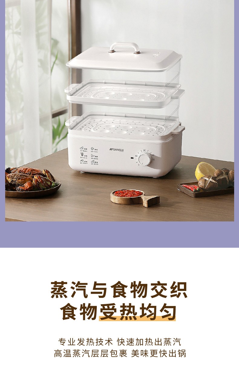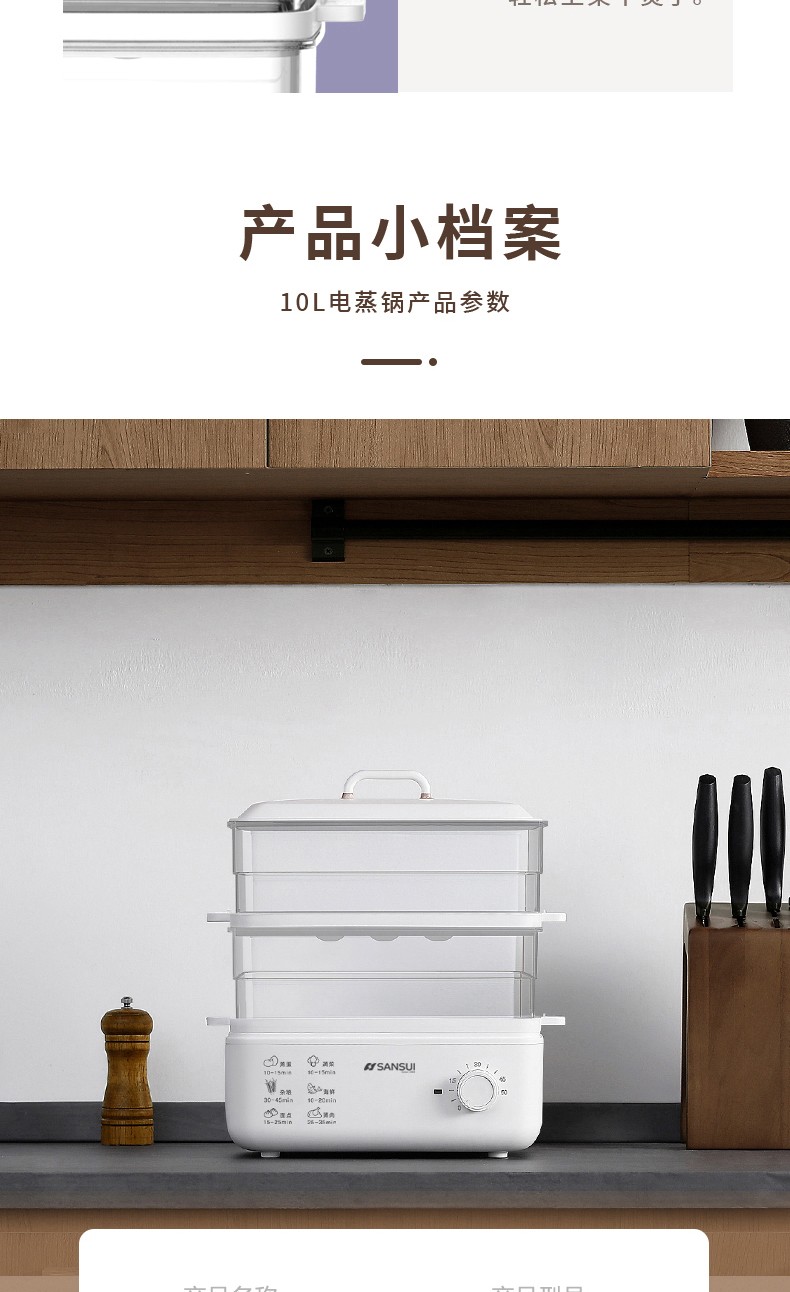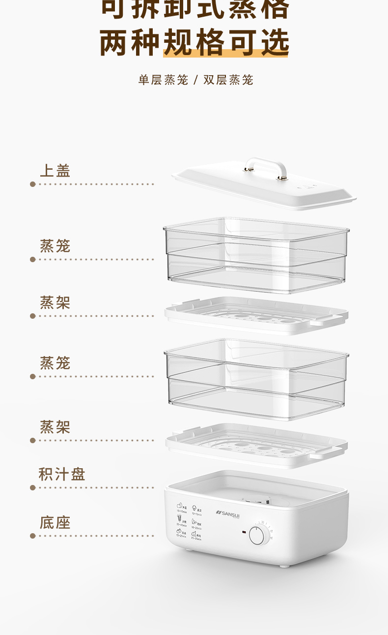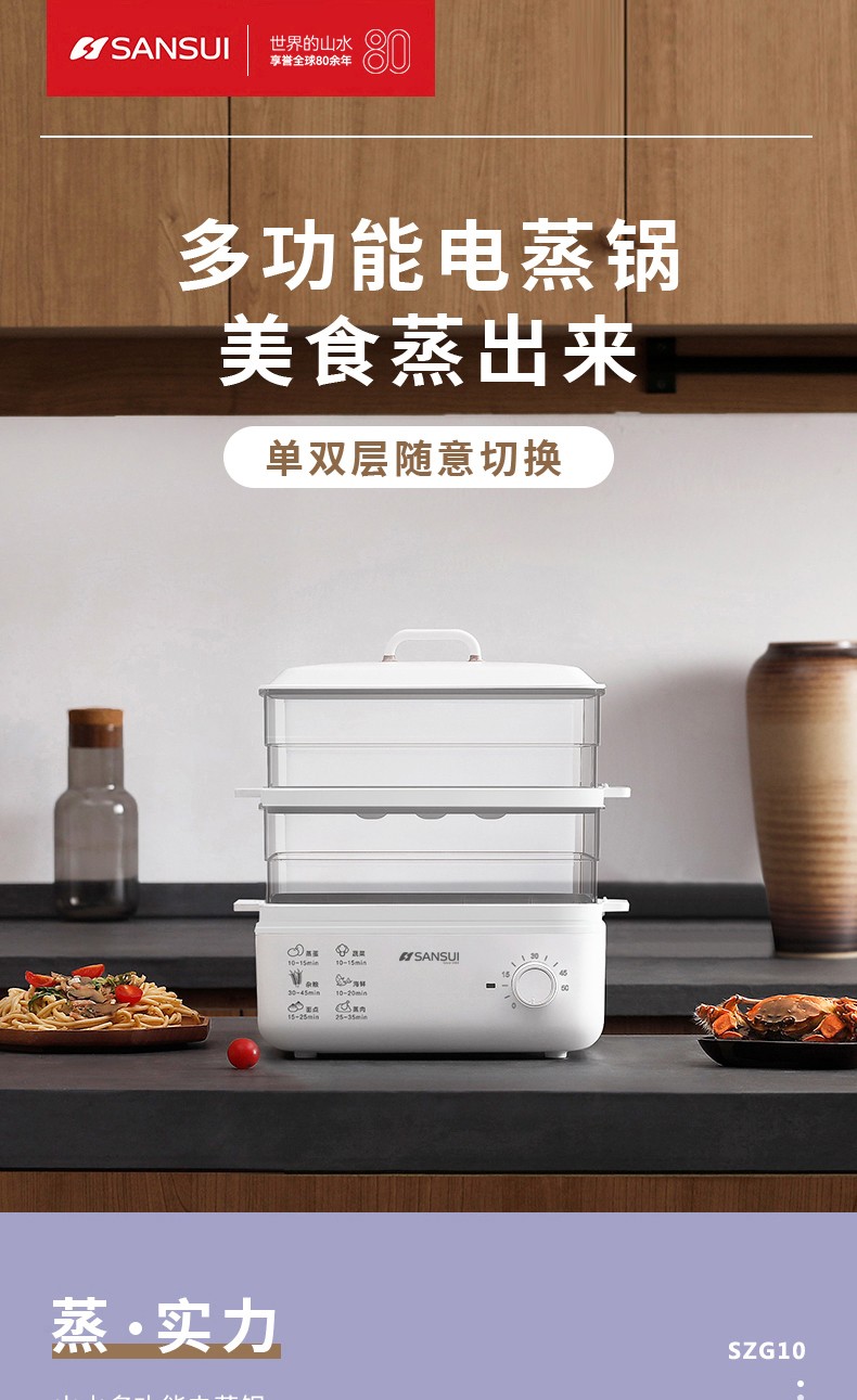 商品名称:(世星阳光)SANSUI山水 电蒸锅10L SZG10 白色 单双层随意切换 空间足够大展厨艺方形蒸盘设计 日常聚餐无压力 可视化透明机身食物情况一目了然