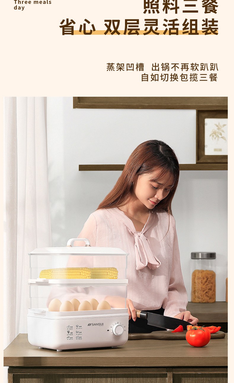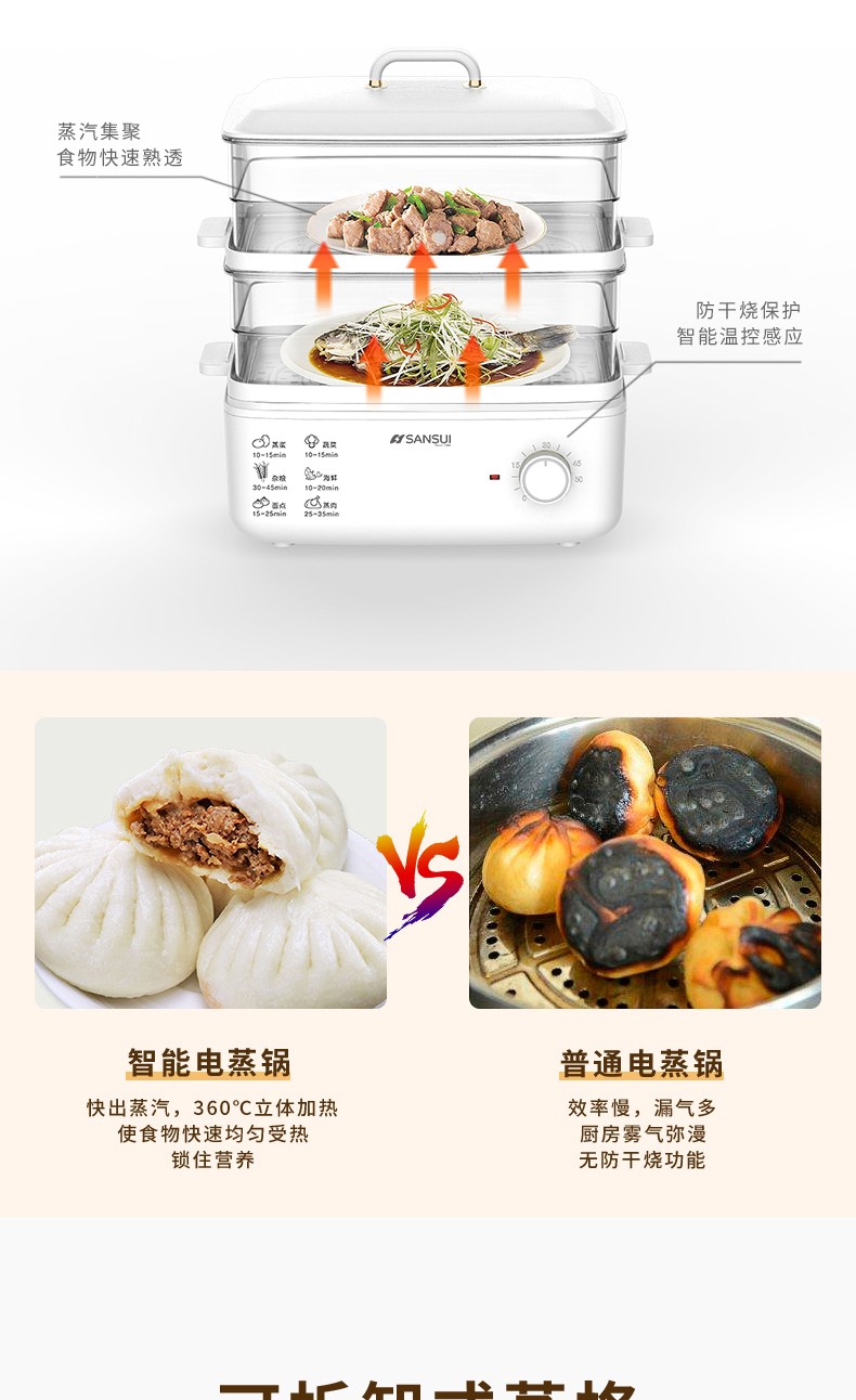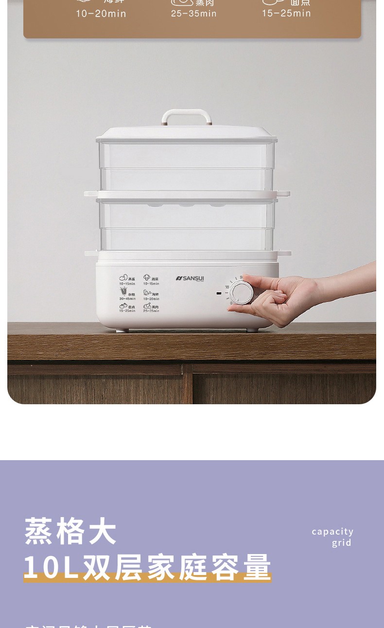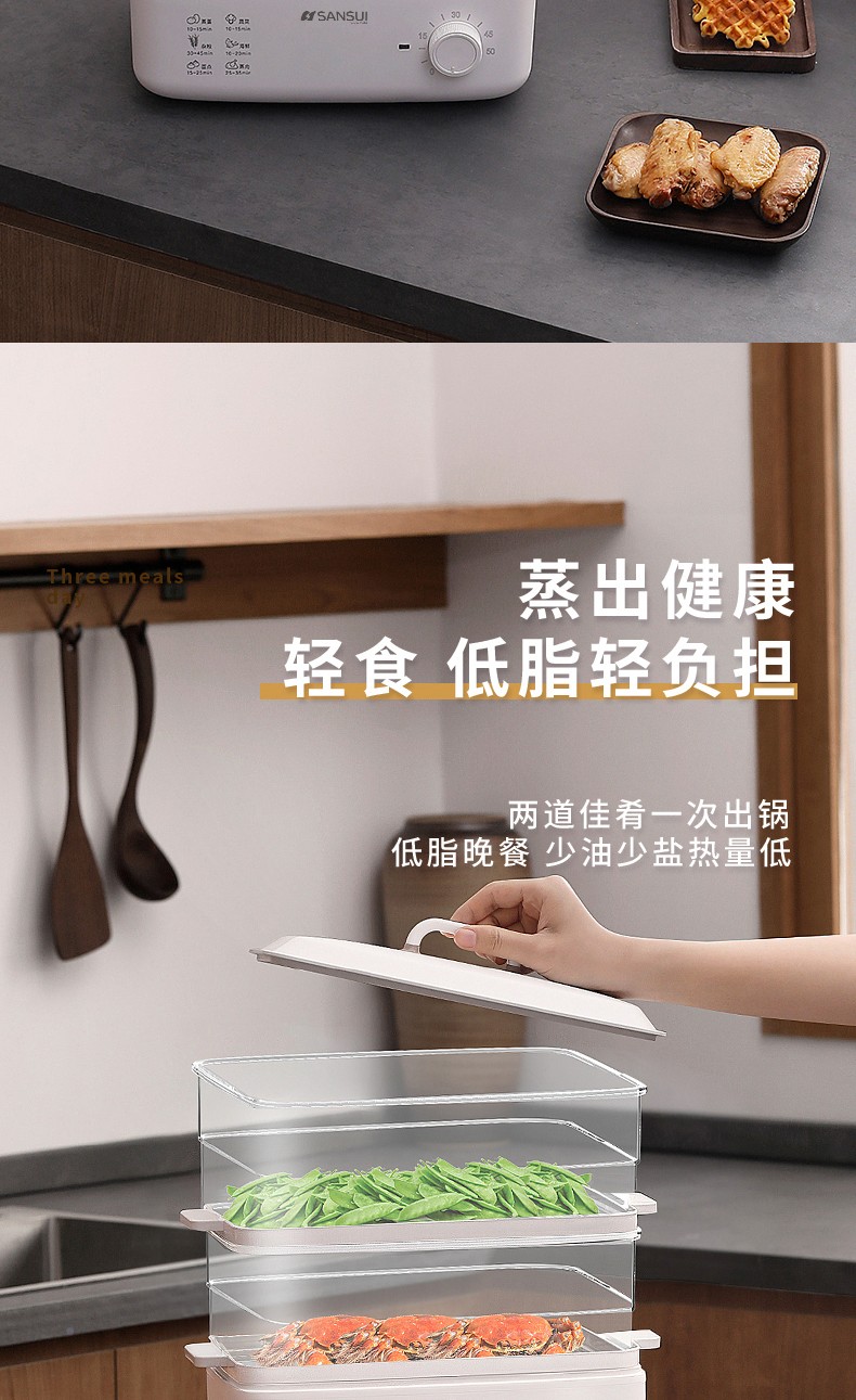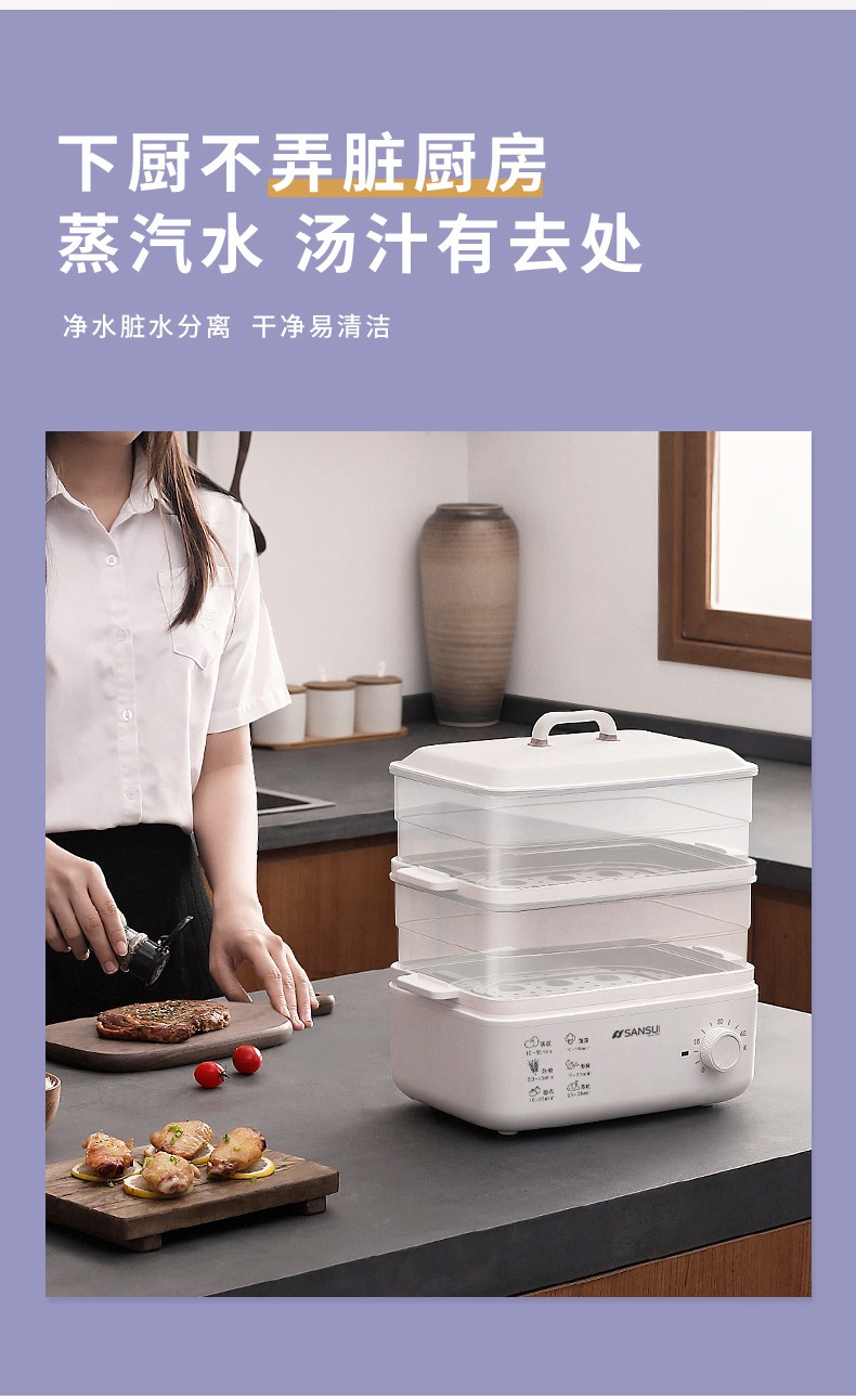 商品名称:(世星阳光)SANSUI山水 电蒸锅10L SZG10 白色 单双层随意切换 空间足够大展厨艺方形蒸盘设计 日常聚餐无压力 可视化透明机身食物情况一目了然