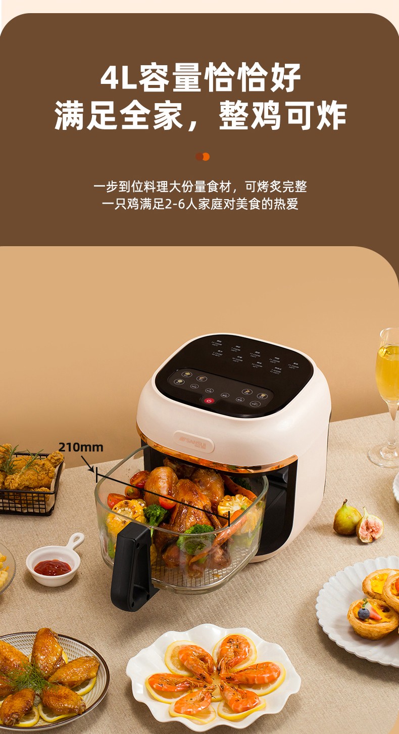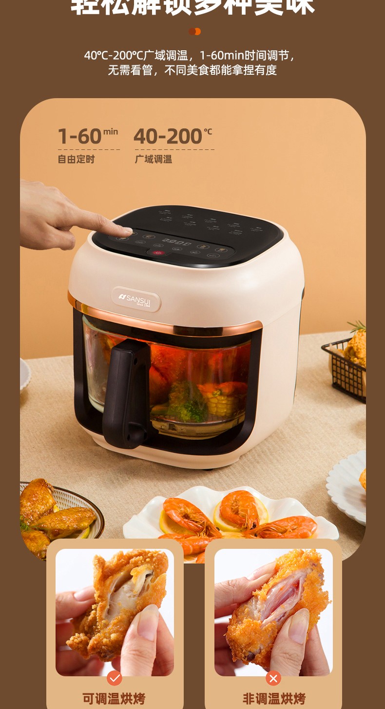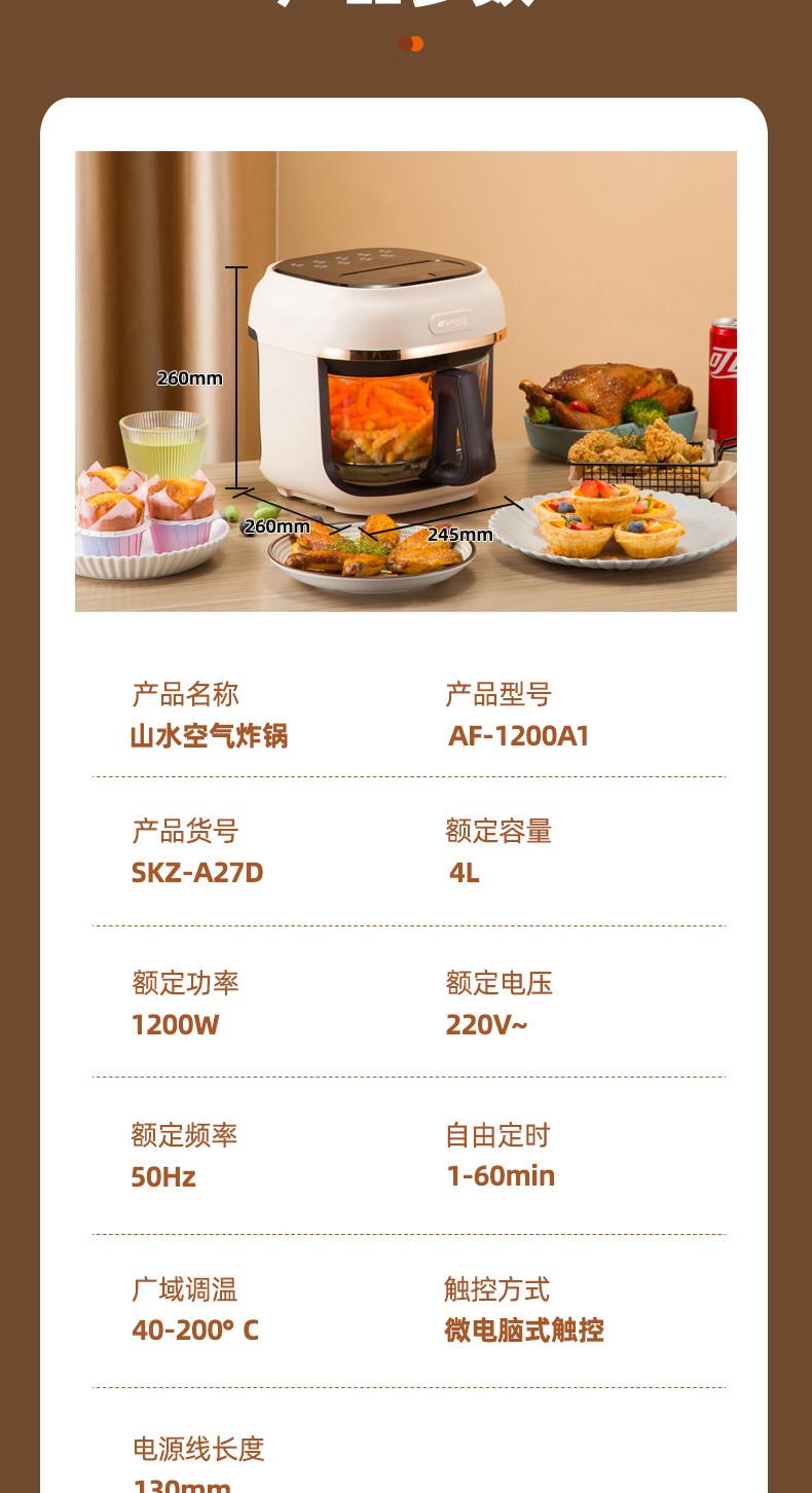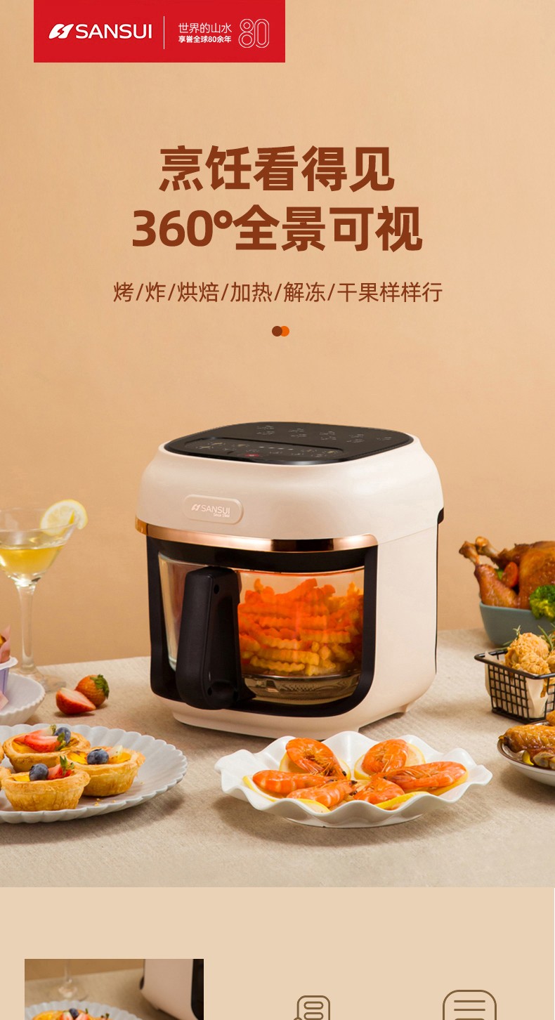 商品名称:(世星阳光)SANSUI山水 可视化空气炸锅 4.0L a27d棕色 烹饪全景可视看得见才放心 一步到位料理大份量食材 可烤炙完整