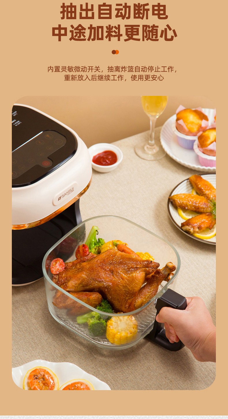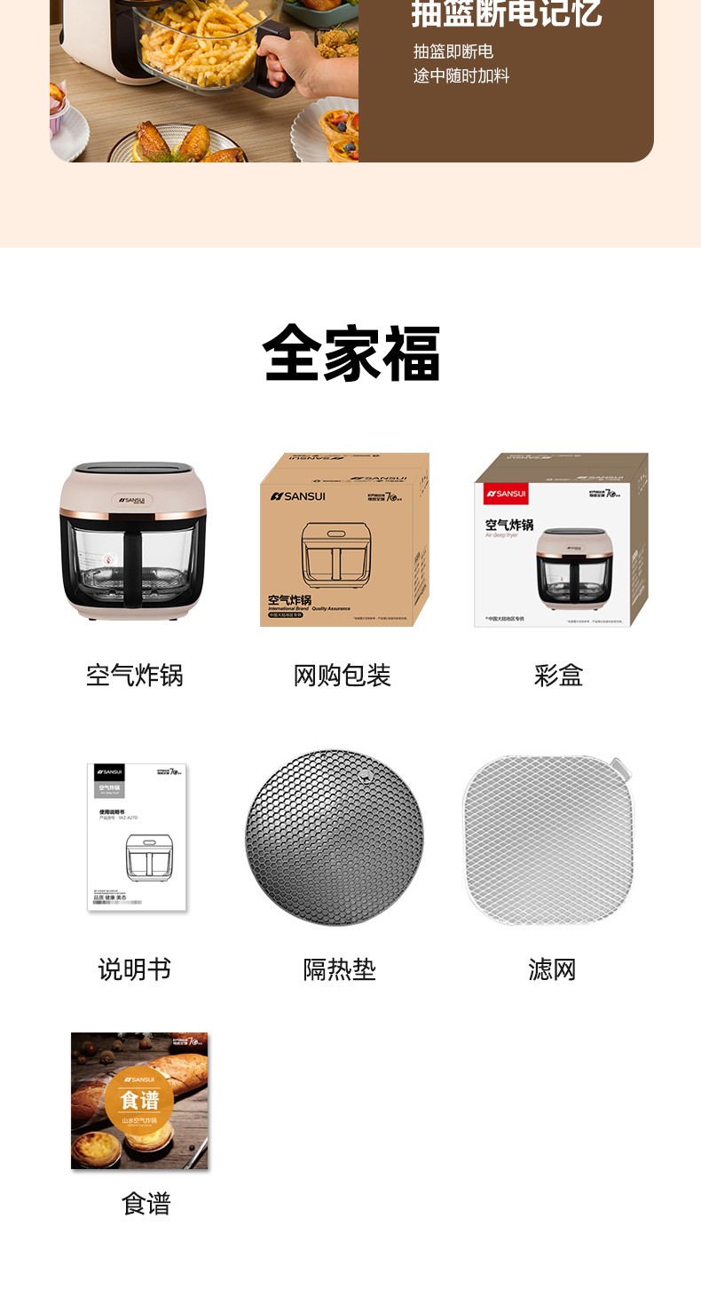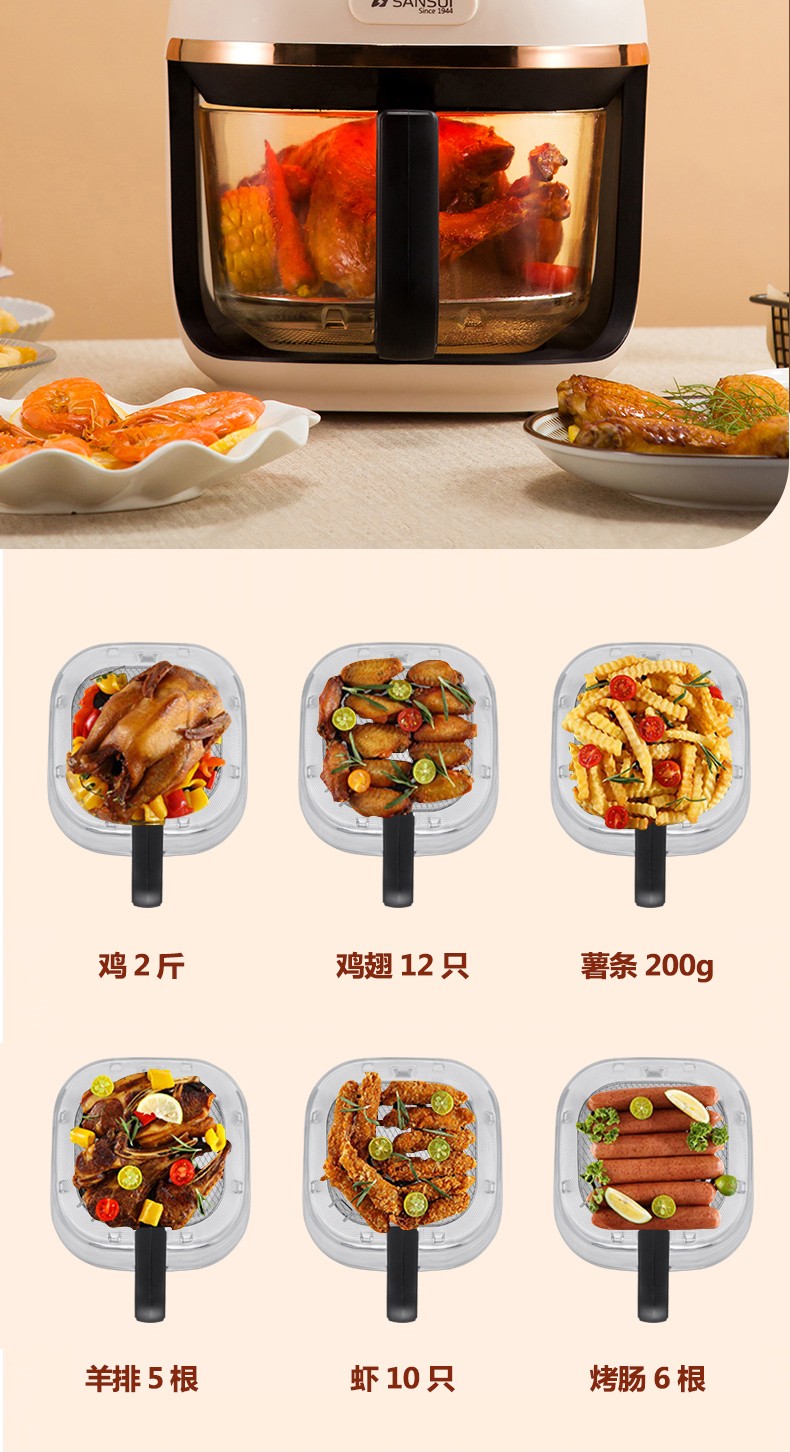商品名称:(世星阳光)SANSUI山水 可视化空气炸锅 4.0L a27d棕色 烹饪全景可视看得见才放心 一步到位料理大份量食材 可烤炙完整